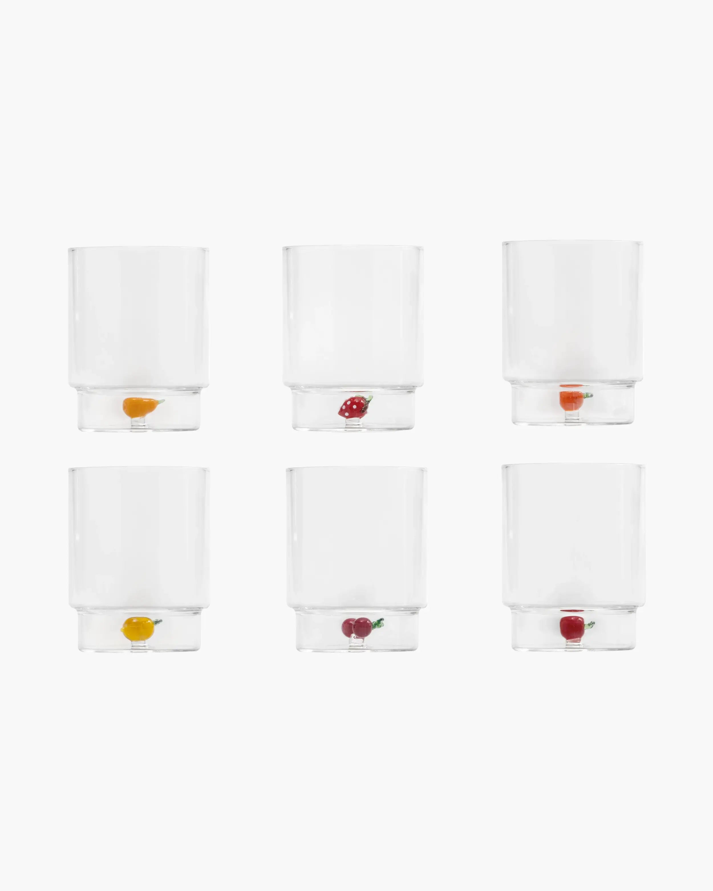 Realizzati in vetro borosilicato di alta qualità, ogni bicchiere di questo set presenta una decorazione unica a tema frutta—arancia, limone, mela, ciliegia, pera e fragola—inserita all'interno di una camera a doppia parete. Questo design innovativo non solo migliora l'aspetto visivo ma mantiene le tue bevande alla temperatura perfetta più a lungo.