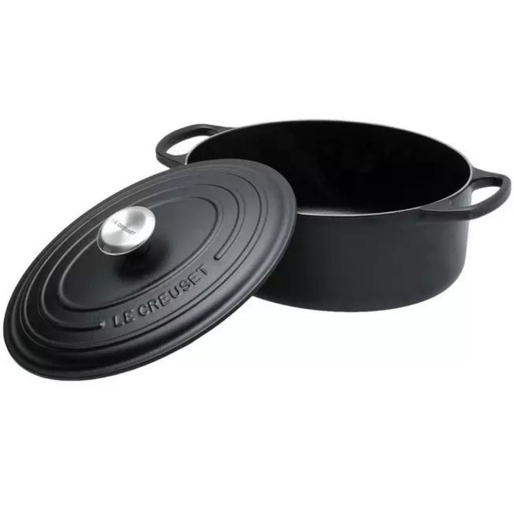 La casseruola ovale in ghisa Le Creuset è realizzata in ghisa di alta qualità, offrendo una ritenzione del calore impareggiabile e una cottura uniforme. La sua superficie interna nera vetrificata resiste alle macchie e migliora la caramellizzazione, mentre l'esterno casseruola nera opaca aggiunge un'estetica raffinata e moderna a qualsiasi cucina.
