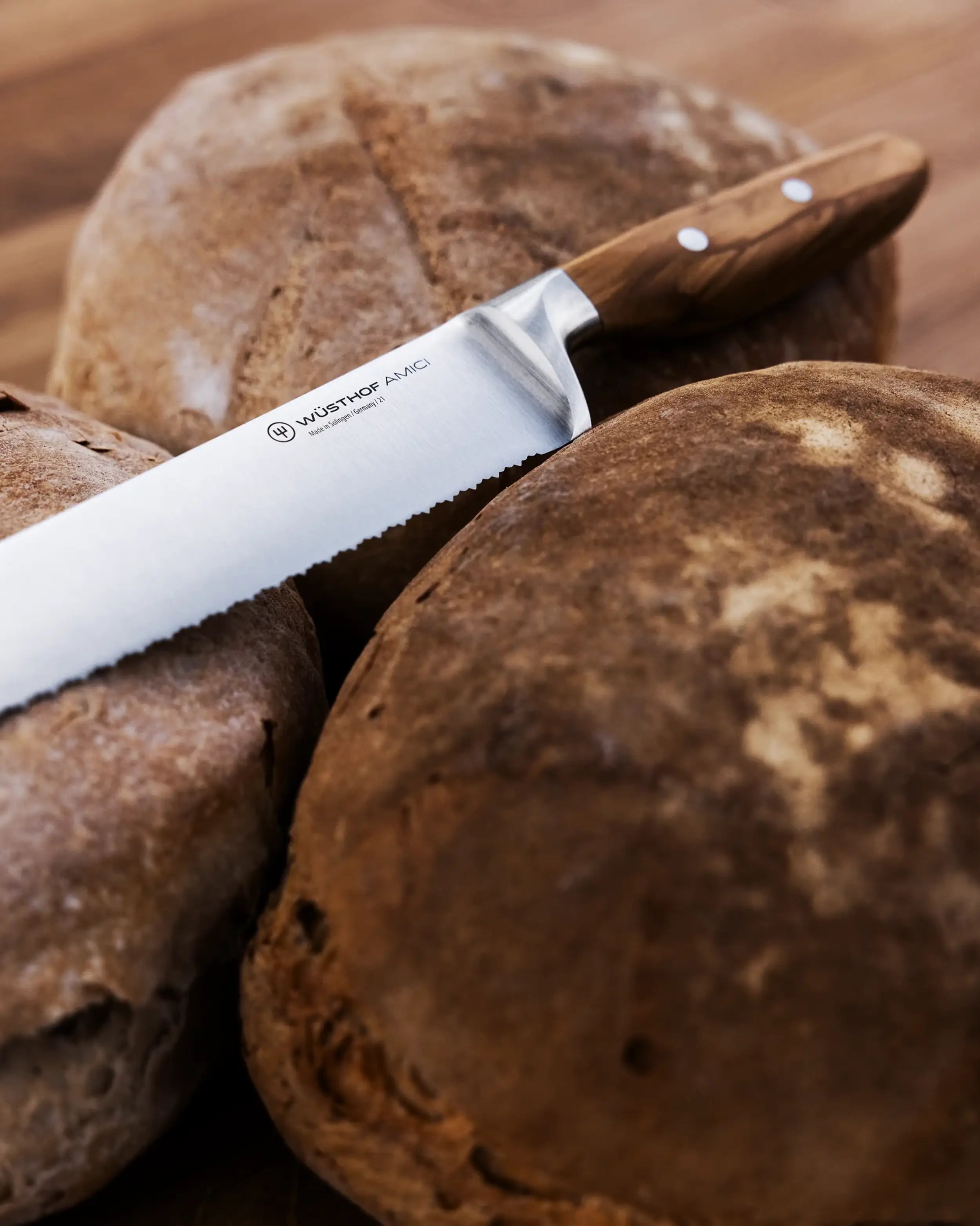 Il coltello da pane a doppia lama seghettata di precisione Wüsthof Amici 23 cm – 9 in porta una finezza senza pari ai tuoi rituali di affettatura. Realizzato con maestria da Wüsthof e parte della raffinata collezione Knives & Co, questa lama eccezionale della Collezione Amici Wüsthof è la tua scelta ideale per tagliare senza sforzo pagnotte artigianali, baguette croccanti e persino frutti dalla buccia spessa.