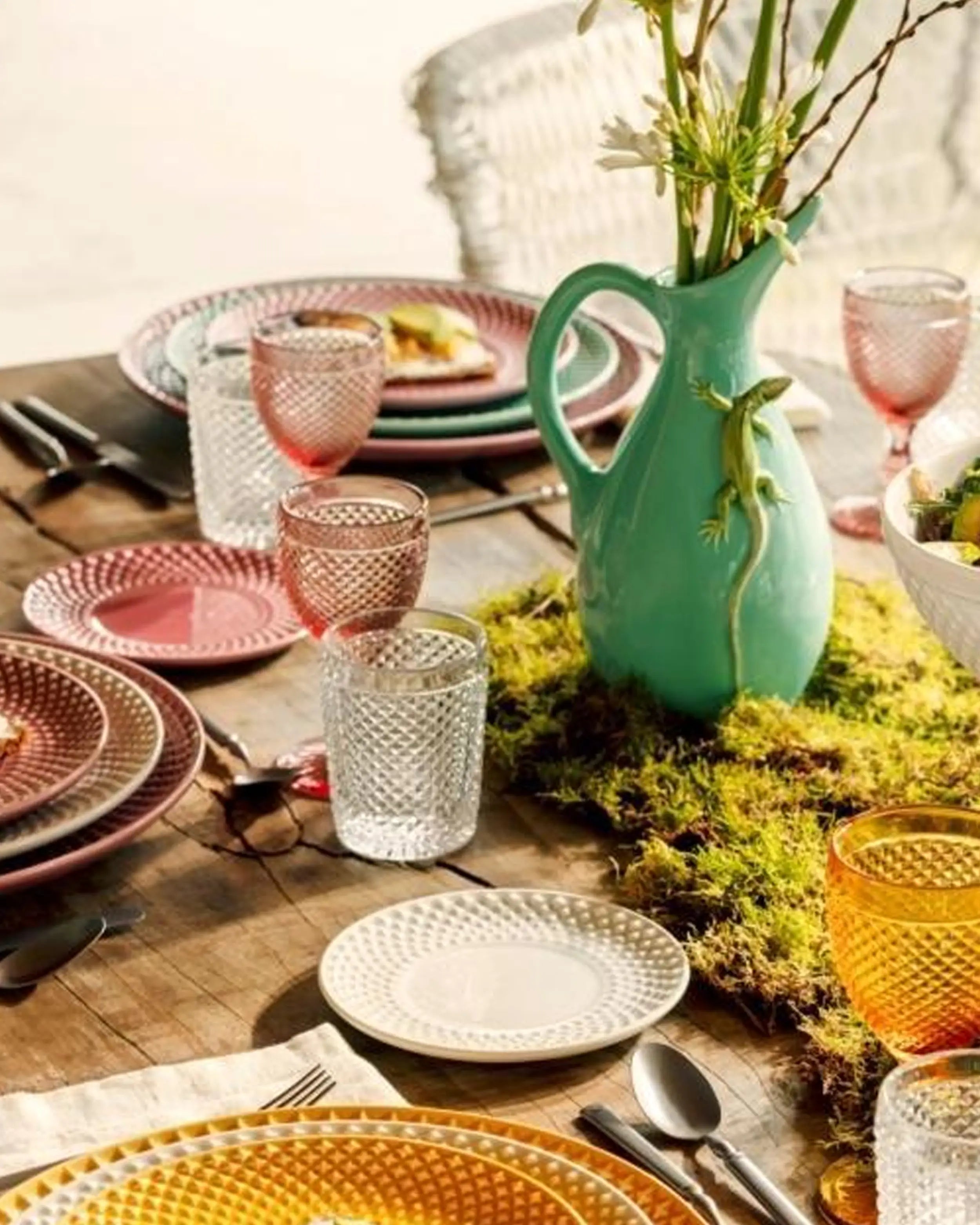 コレクションは複数の直径と、アンバー、ミネラルグレー、ミントグリーン、ピンクの厳選されたパレットで提供されているため、気分に合わせてテーブルをデザインできます:平日の夕食にはミネラルで落ち着いた色合い、春のパーティーにはミントの爽やかさ、キャンドルライトを温かくするアンバー。マッチするボウルやサラダピースと組み合わせて完全なセッティングを作るか、色を混ぜてコレクション感のある見た目にすることも可能です。ファセットのレリーフは食材の自然な色調を増幅し、シンプルなレシピでもどんな光の下でも考え抜かれた写真映えする印象を与えます。
