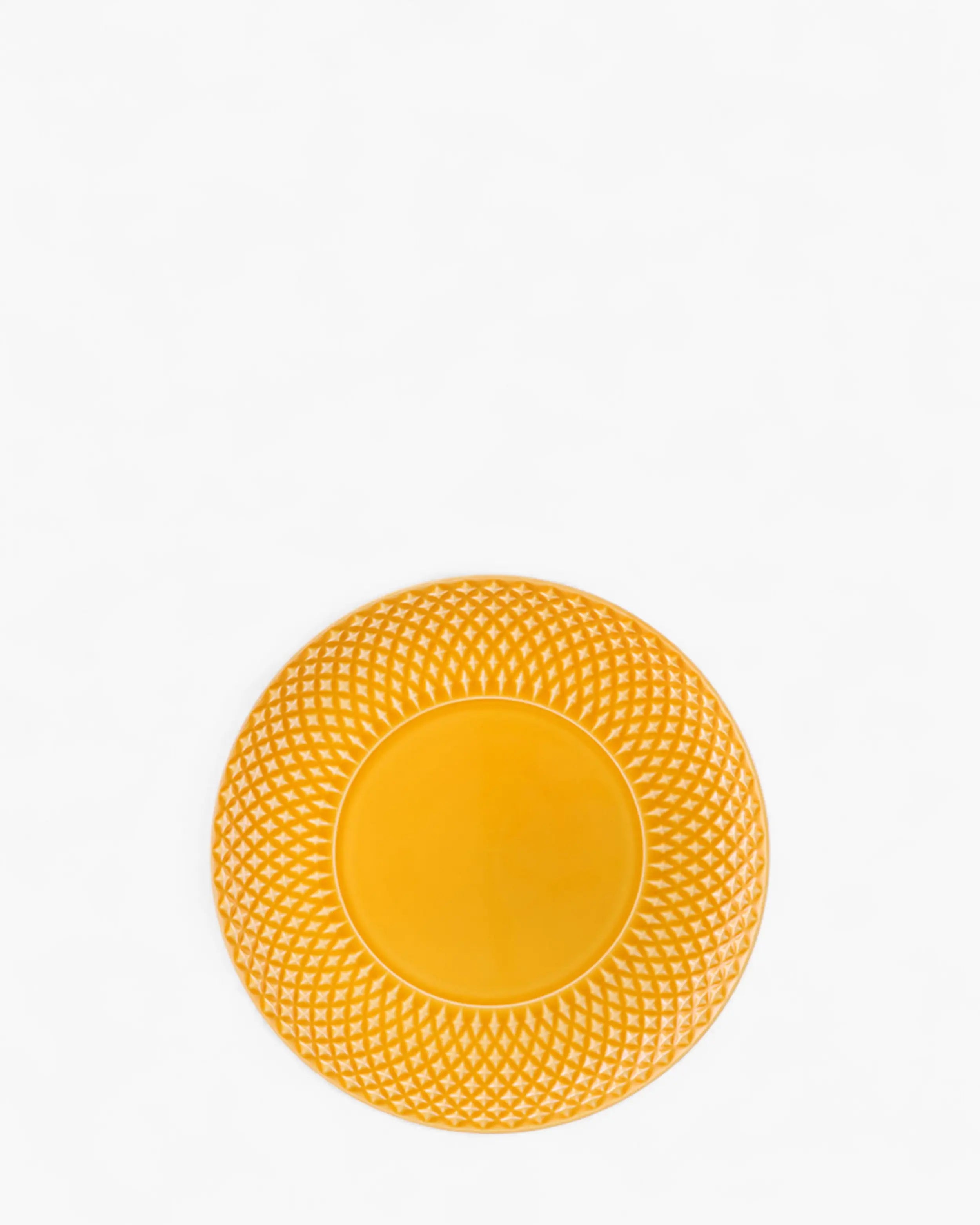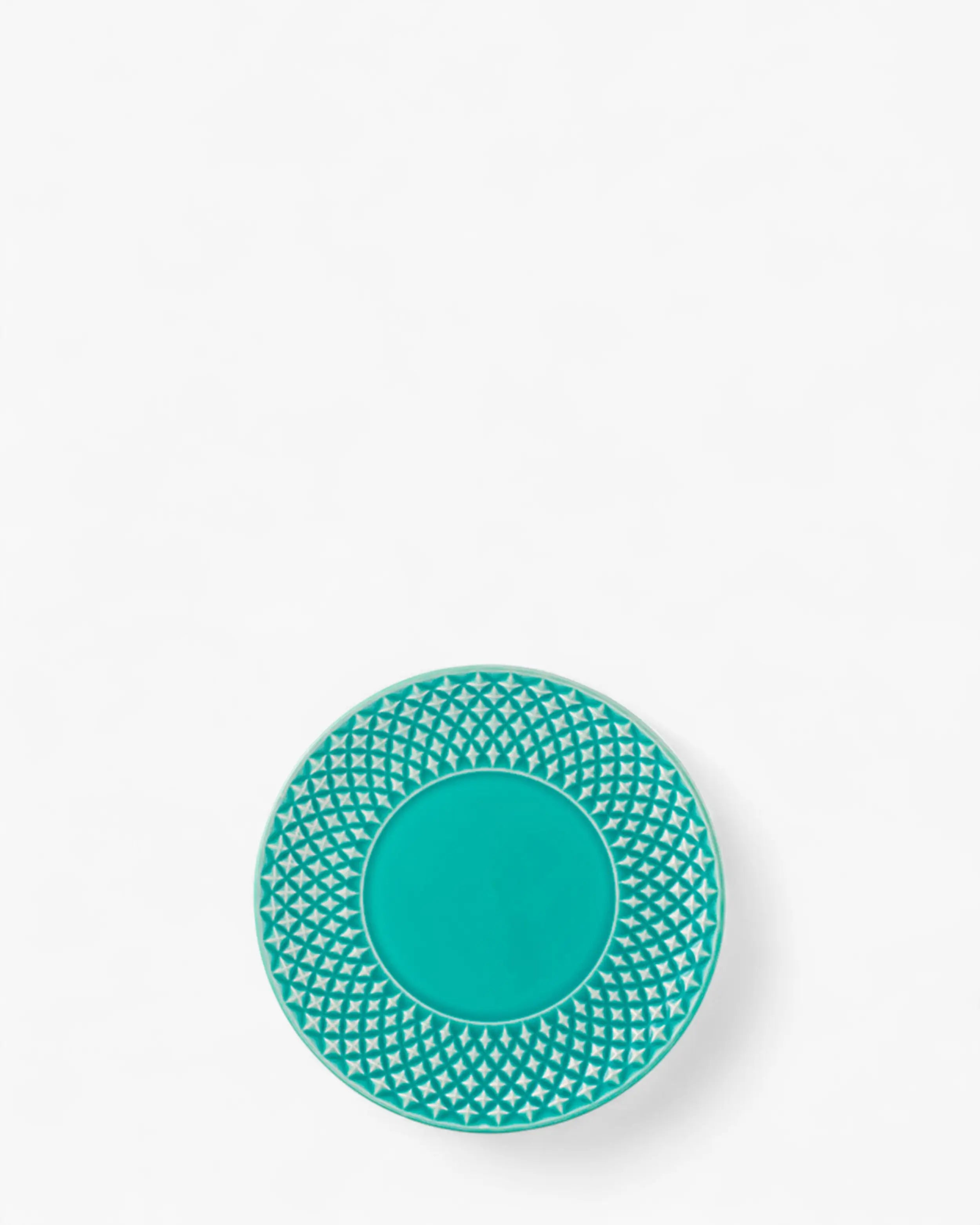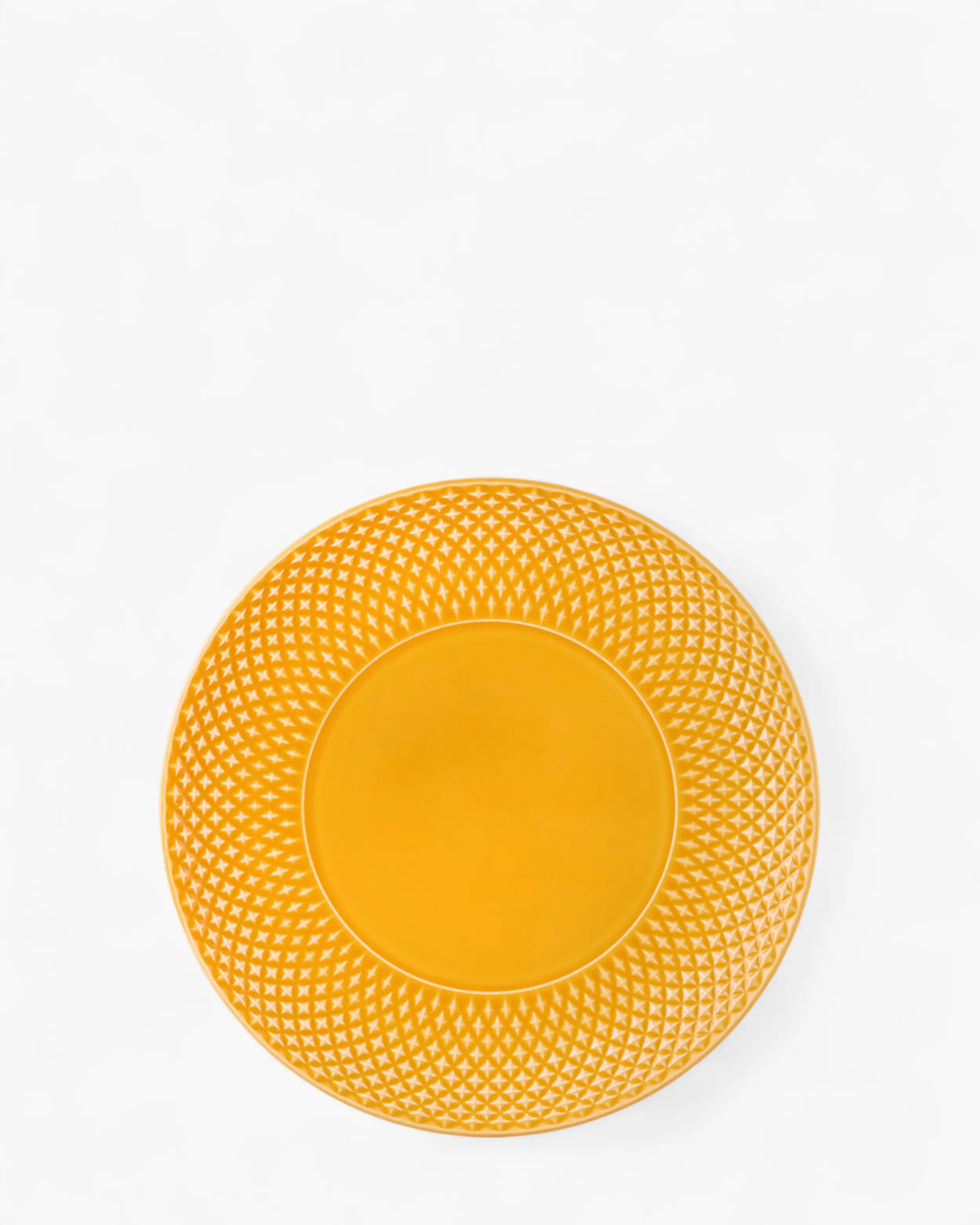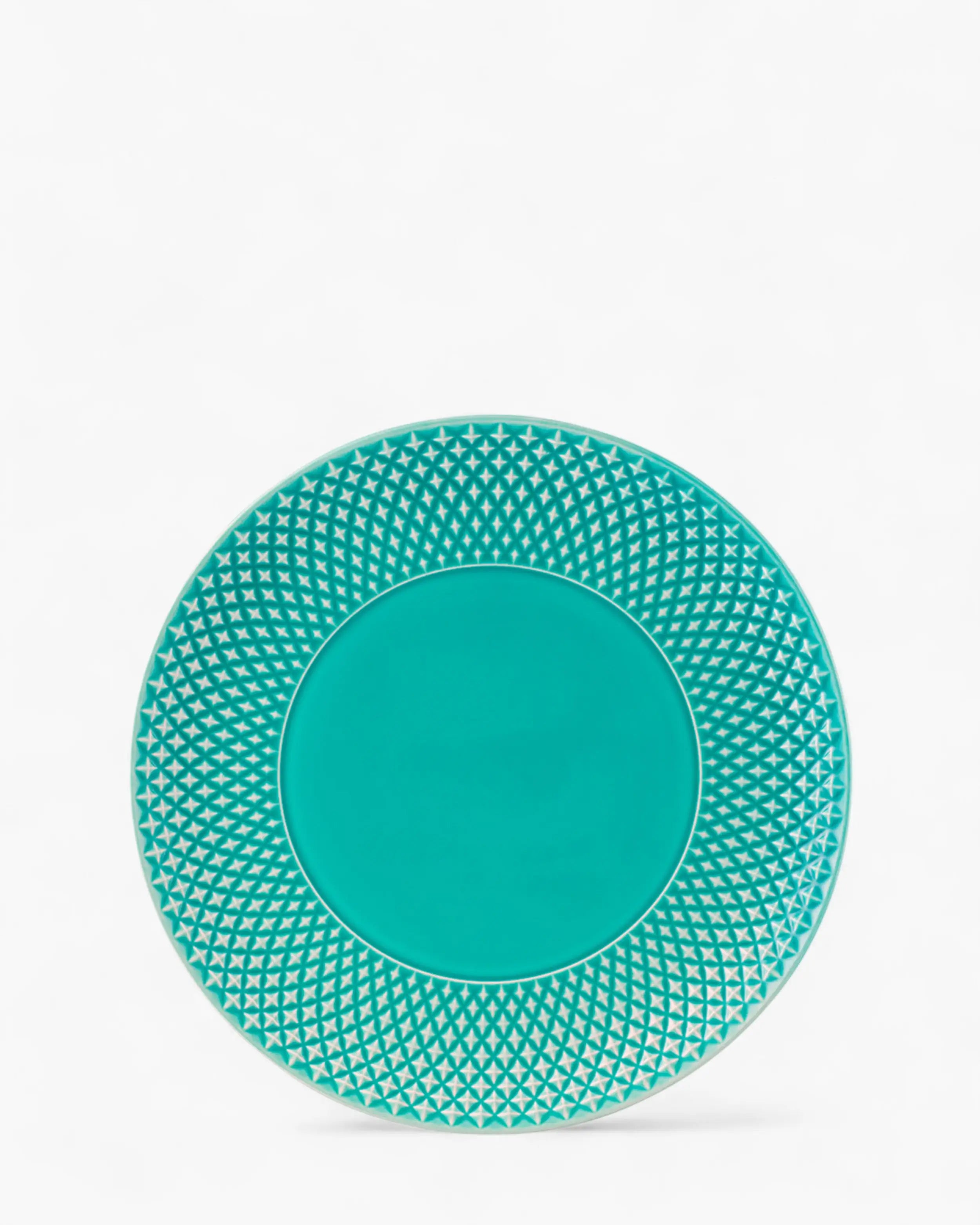 Bordallo Pinheiro Bicosプレートは、影と光の対話です:目を引くが主役を奪わない、小さなダイヤモンドの鮮明なグリッド。この