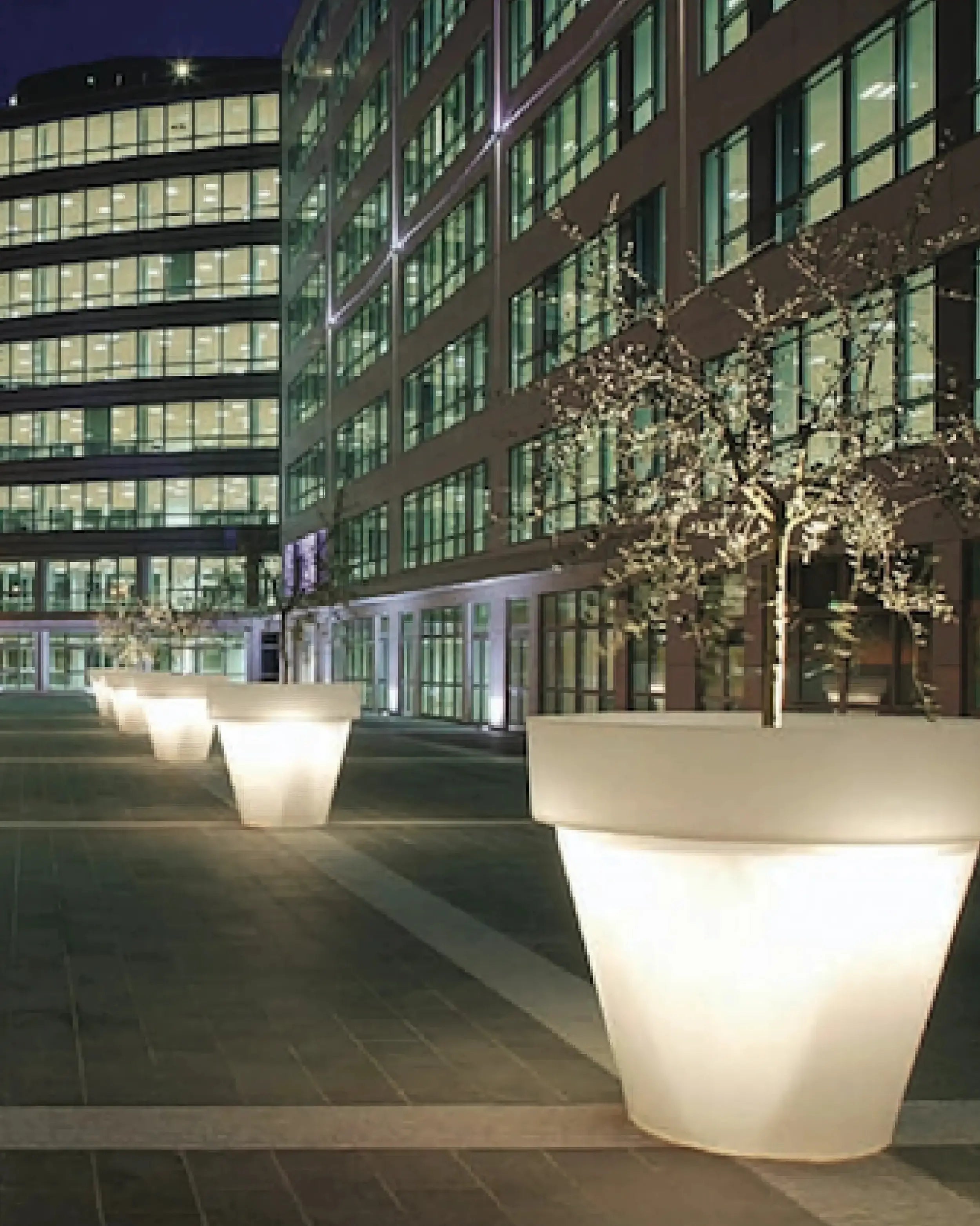 Serralunga plantersのカテゴリーに属するこの照明付きVas One/Twoは、他の有名な作品と対話しています。Serralunga lightingと自然に統合され、Pedrali seatsの機能的なエレガンスと調和します。これらの要素が一体となり、光、形、デザインが調和する統一された景観を作り出します。光るガーデンポットや大型LEDベースとして称賛され、ラグジュアリーな屋外照明が空間を没入型の体験に変える例を示しています。