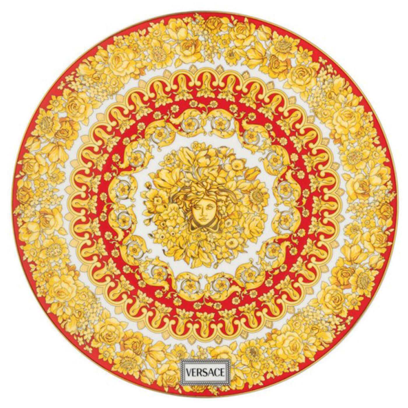 Shop Decor直径 33 cm の Medusa Rhapsody レッド サービス プレートをご紹介します。金色のバロック スタイルの花のモチーフが特徴の Medusa Rhapsody コレクションのプレート、カップ、その他のアクセサリーは、テーブルやご自宅を美しく飾り、他にはない優雅さと洗練さを添えるのに最適です。Versace Versace Homeの紛れもない芸術で、あらゆる機会を特別なものにしましょう。