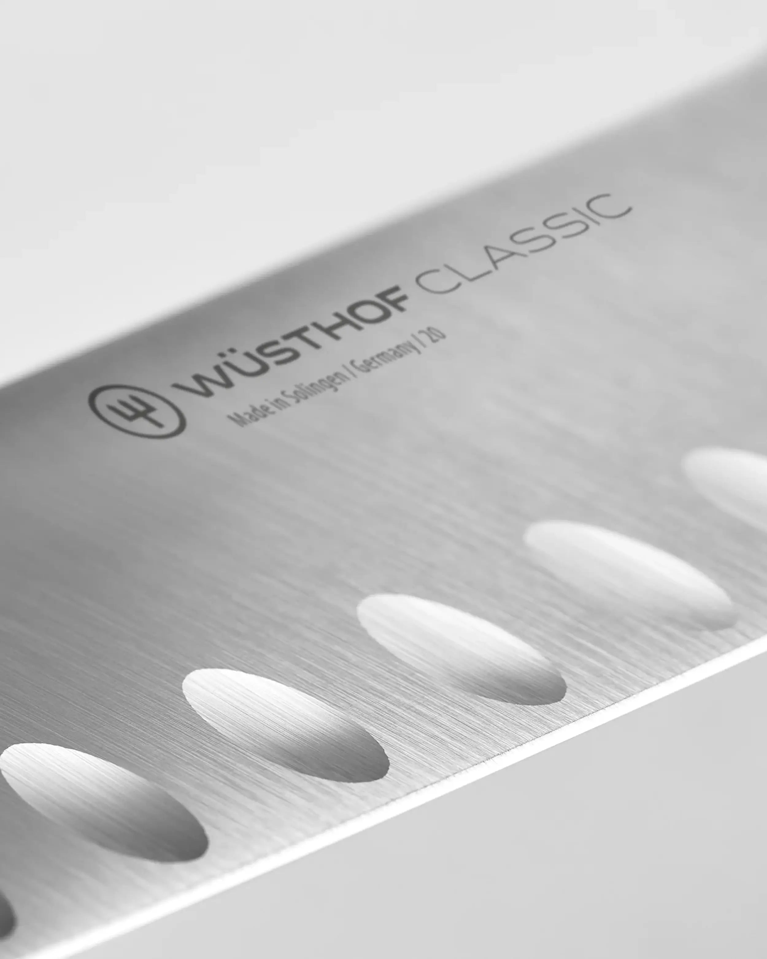 ゾーリンゲンで高炭素スチールの一枚から作られたこの包丁は、最大の耐久性を保証する特別な焼き入れ工程を経ています。中空刃は特徴的な波状の切れ込みがあり、刃と食材の間に小さな空気のポケットを作り、くっつきを防ぎ、動作をより滑らかにします。Wüsthofによって設計されたこの刃は、下ごしらえ作業をシームレスで満足のいくプロセスに変えます。