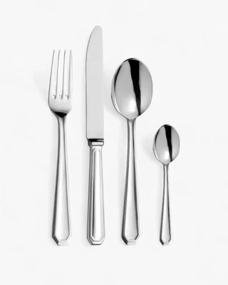 The broggi castiglione cutlery flatware set includes six table spoons, six table forks, six table knives, and six tea spoons—providing everything needed for a seamless dining experience. Perfectly crafted for elegance and functionality, this set enhances every meal with a refined touch.