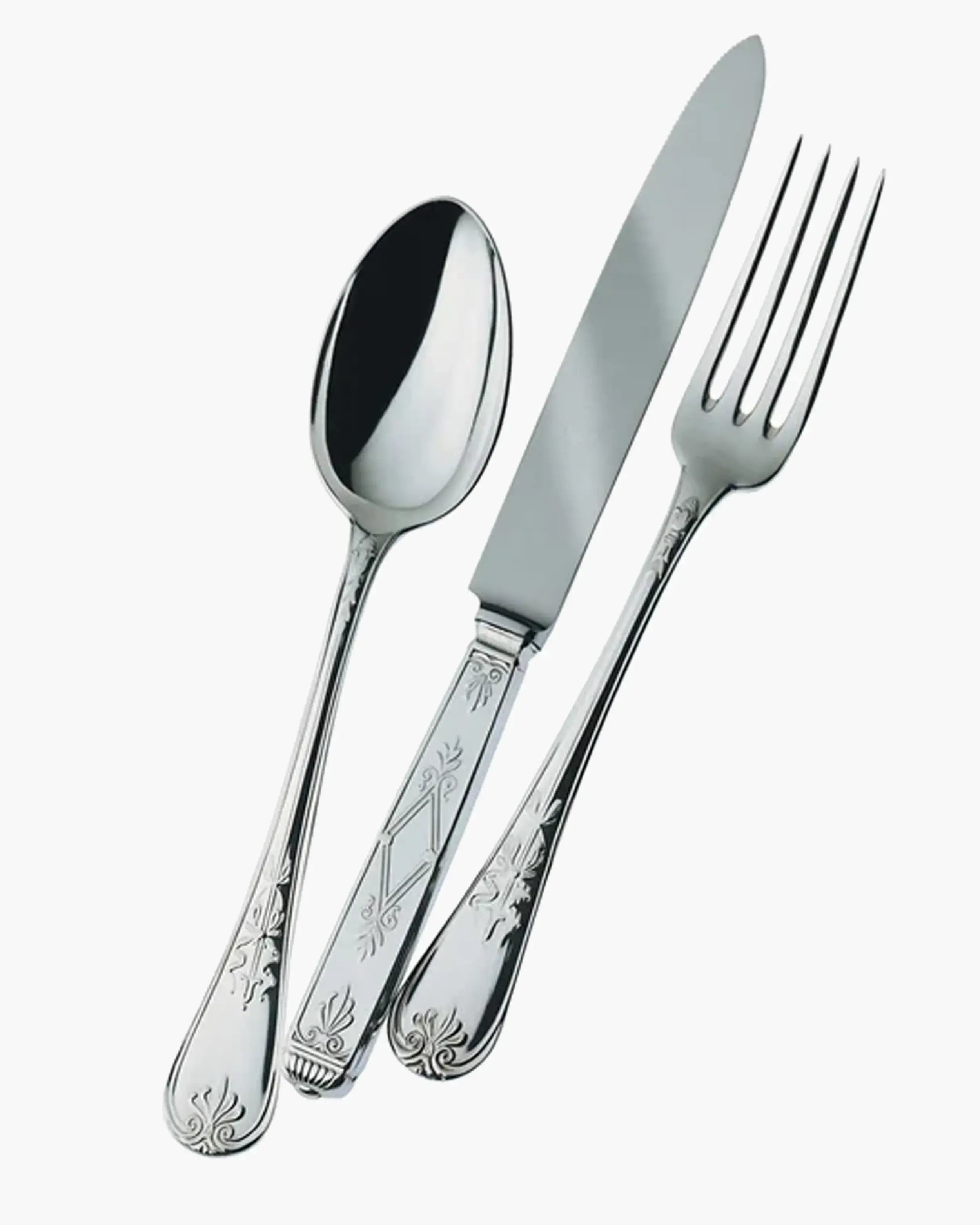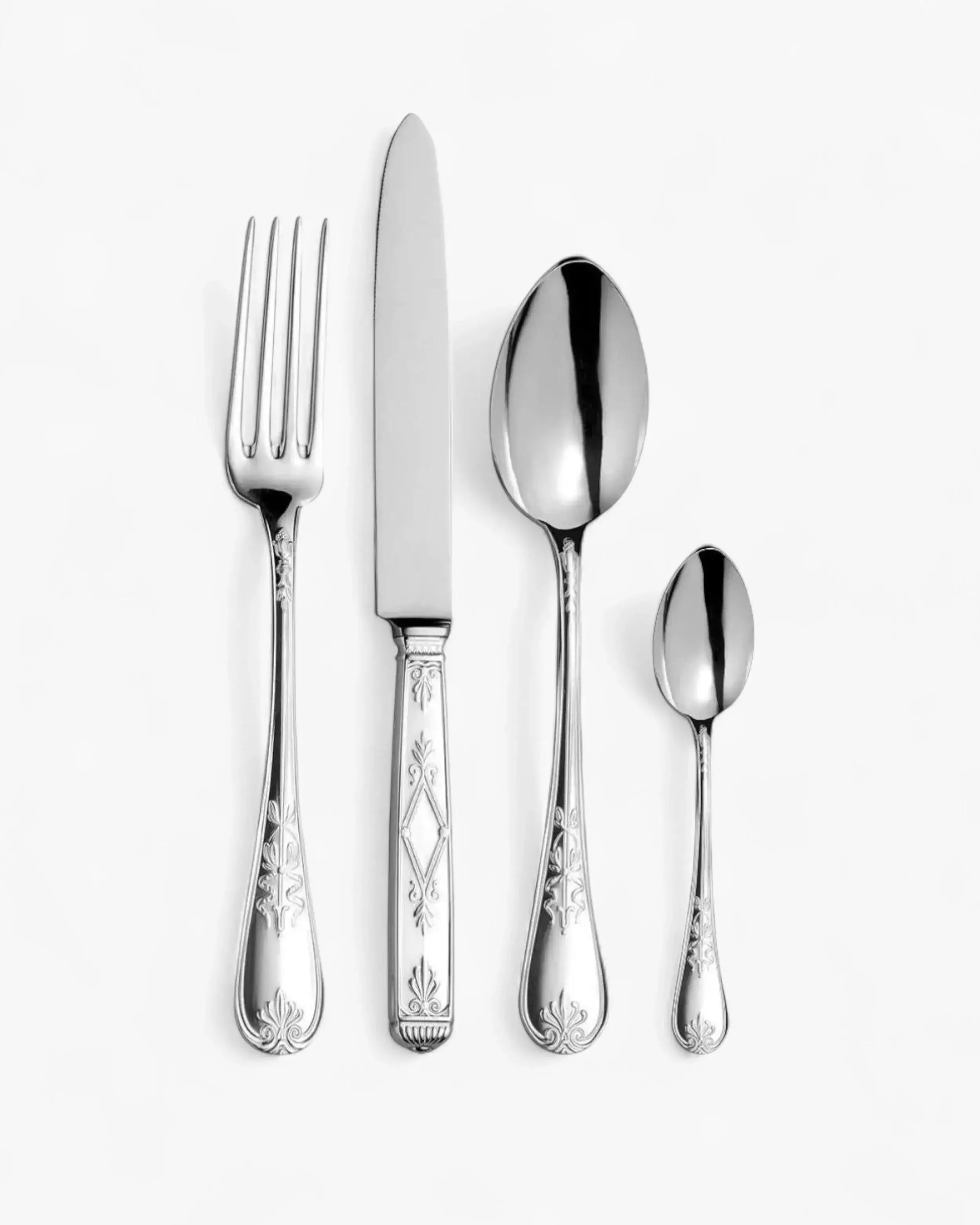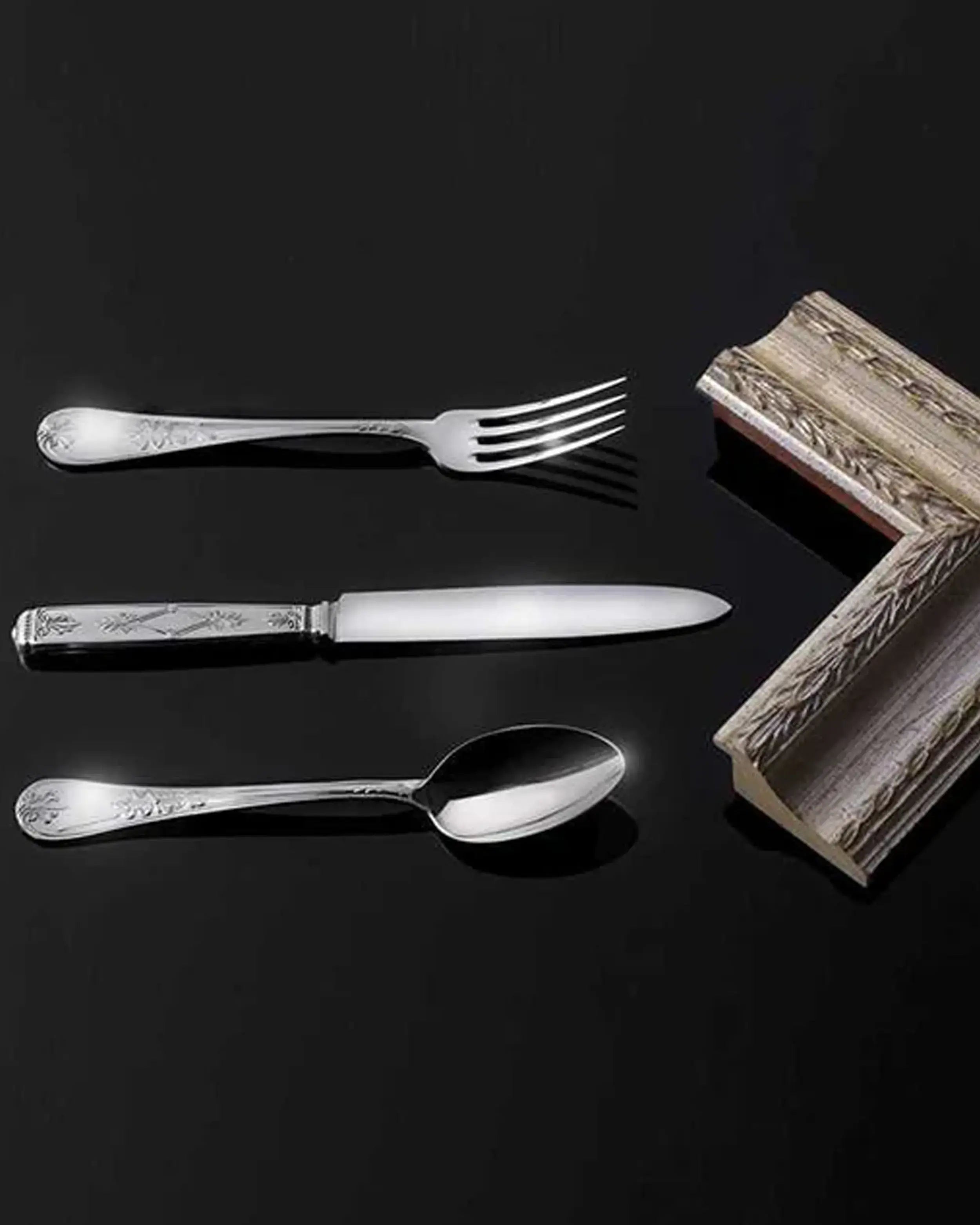 The broggi excelsior cutlery includes six table spoons, six table forks, six table knives, and six tea spoons. Each piece is meticulously designed to bring harmony and refinement to your dining tableware, whether for formal occasions or intimate dinners.