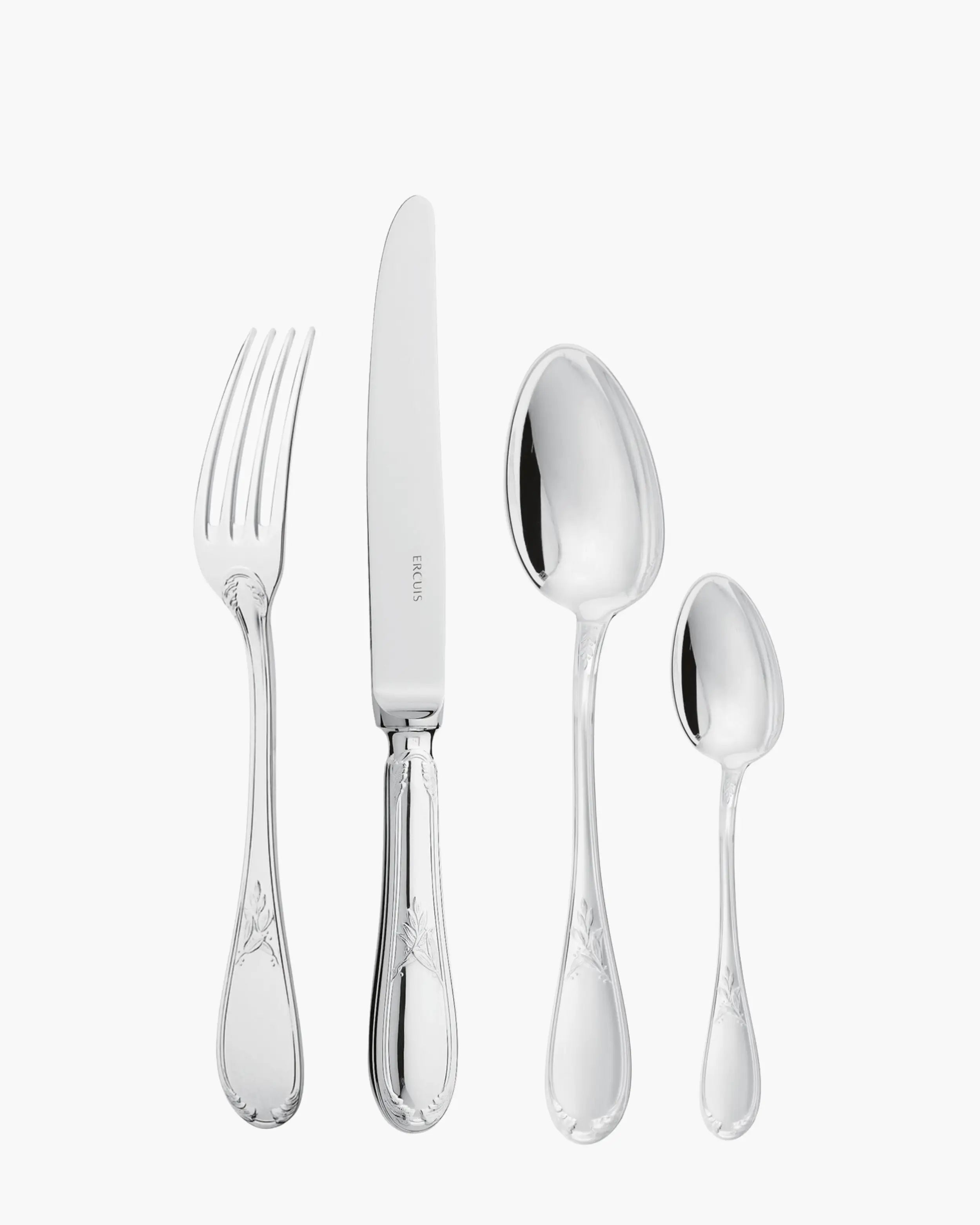This elegant 24-piece cutlery set includes dinner spoons, forks, knives, and dessert spoons: composed to suit grand dinners and refined everyday meals alike. With its delicate embossing and lustrous finish, each element in the silverware collection contributes to a tablescape that celebrates craftsmanship and timeless design. The balanced weight and slender profile enhance the tactile experience, turning simple gestures into rituals of elegance for your Ercuis tableware.Versatility and harmony in composition