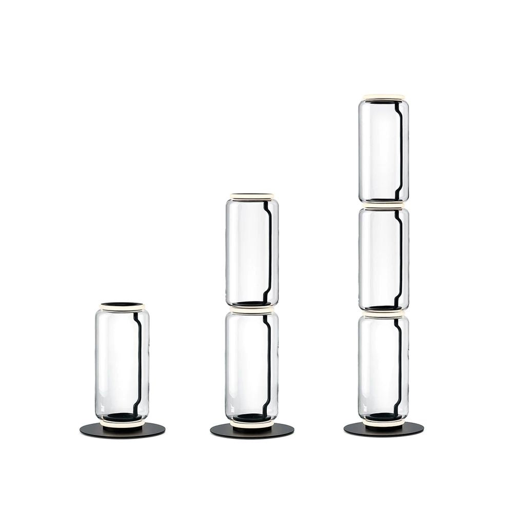 Dimmable floor lamp - Indoor use - Lamp composed by a blown glass module - Base and rings made of aluminium - Ring diffusers in optical silicone - Power cable length: 2 meters