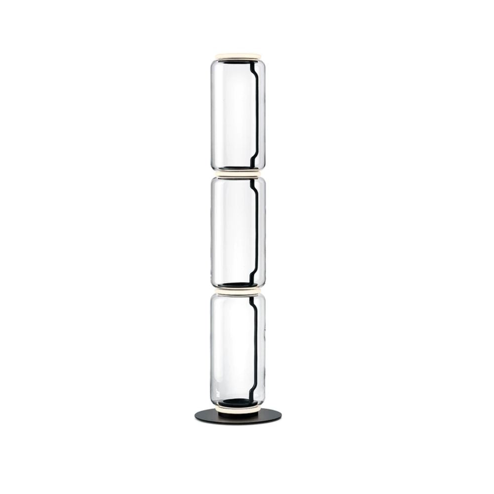 Dimmable floor lamp - Indoor use - Lamp composed by 3 blown glass modules - Base and rings made of aluminium - Ring diffusers in optical silicone - Power cable length: 2 meters