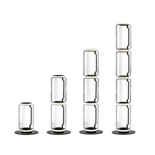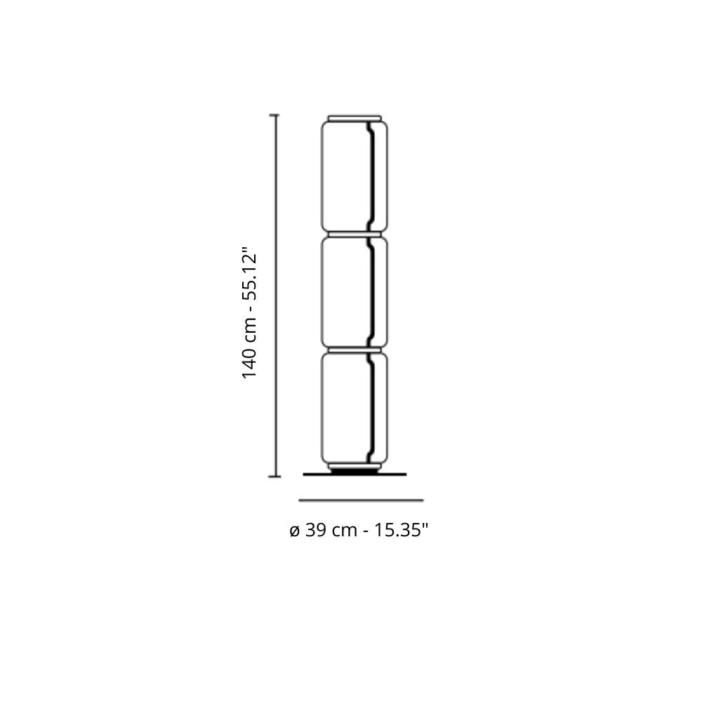 Dimmable floor lamp - Indoor use - Lamp composed by 3 blown glass modules - Base and rings made of aluminium - Ring diffusers in optical silicone - Power cable length: 2 meters