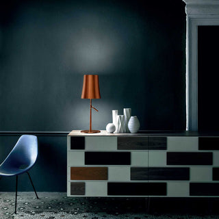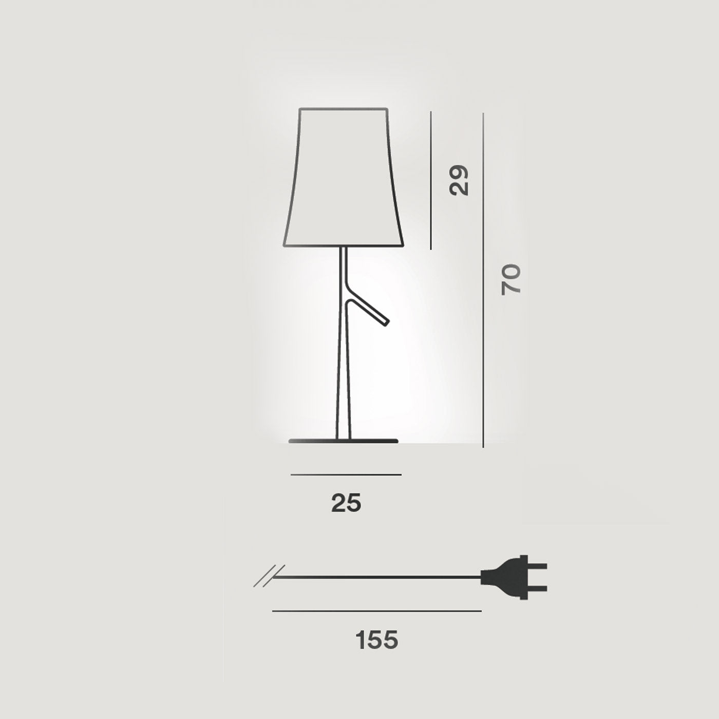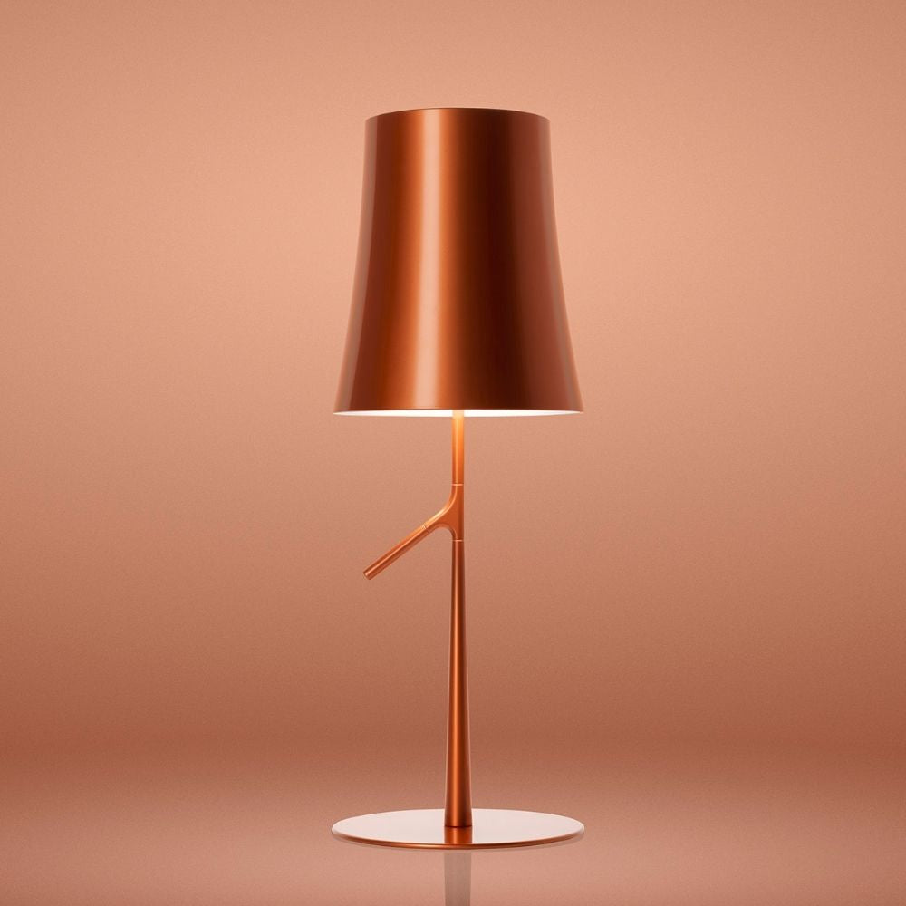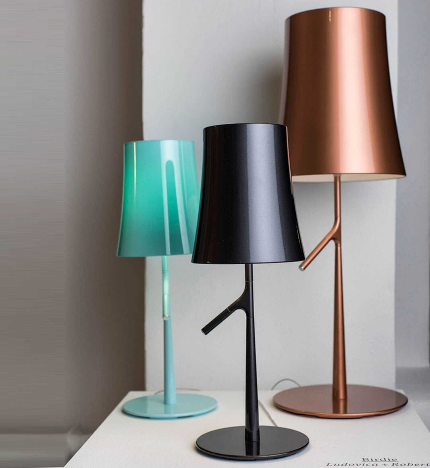 The large Birdie table lamp in different colours, designed by designers Ludovica and Roberto Palomba for Foscarini, is inspired by the classic lampshade with a modern twist. The lamp emits a diffused and downward-oriented light, to create a delicate and elegant play of light and shadow in the space. The Birdie lamp features a touch-dimmer ignition system designed in the shape of a branch ready to welcome a bird: a gentle association to the name of the object.