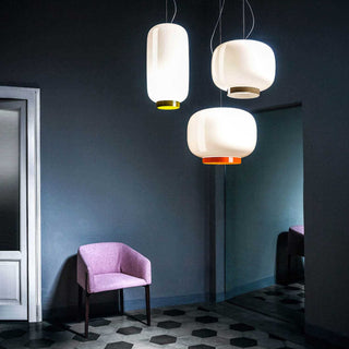 Chouchin 2 Reverse, belonging to the Chouchin collection designed by Ionna Vautrin for Foscarini, is a suspension lamp in painted blown glass. Choucin 2 Reverse is formed by a white diffuser and emits a warm and intense light that, thanks to the lower green border, creates in the room below a bright circle. Chouchin 2 Reverse has a modern and simple style and is ideal for lighting medium and large rooms.