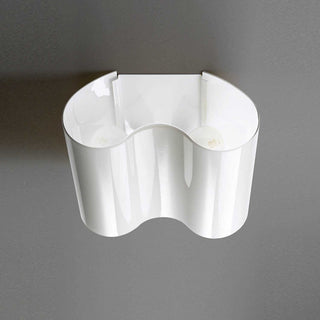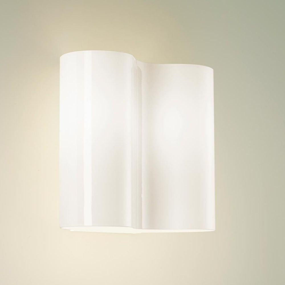 Double white glass wall lamp, designed by Valerio Bottin for Foscarini, is a classic element made of blown glass. Double has a wavy shape that encloses the two light sources which diffuse a bright light downwards and towards the ceiling. The lamp thus creates elegant and engaging light reflections. Double is made in different variations.