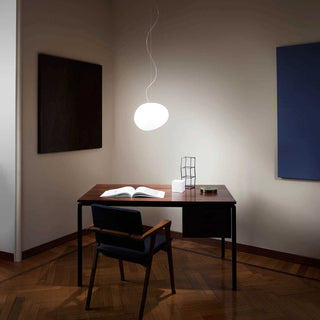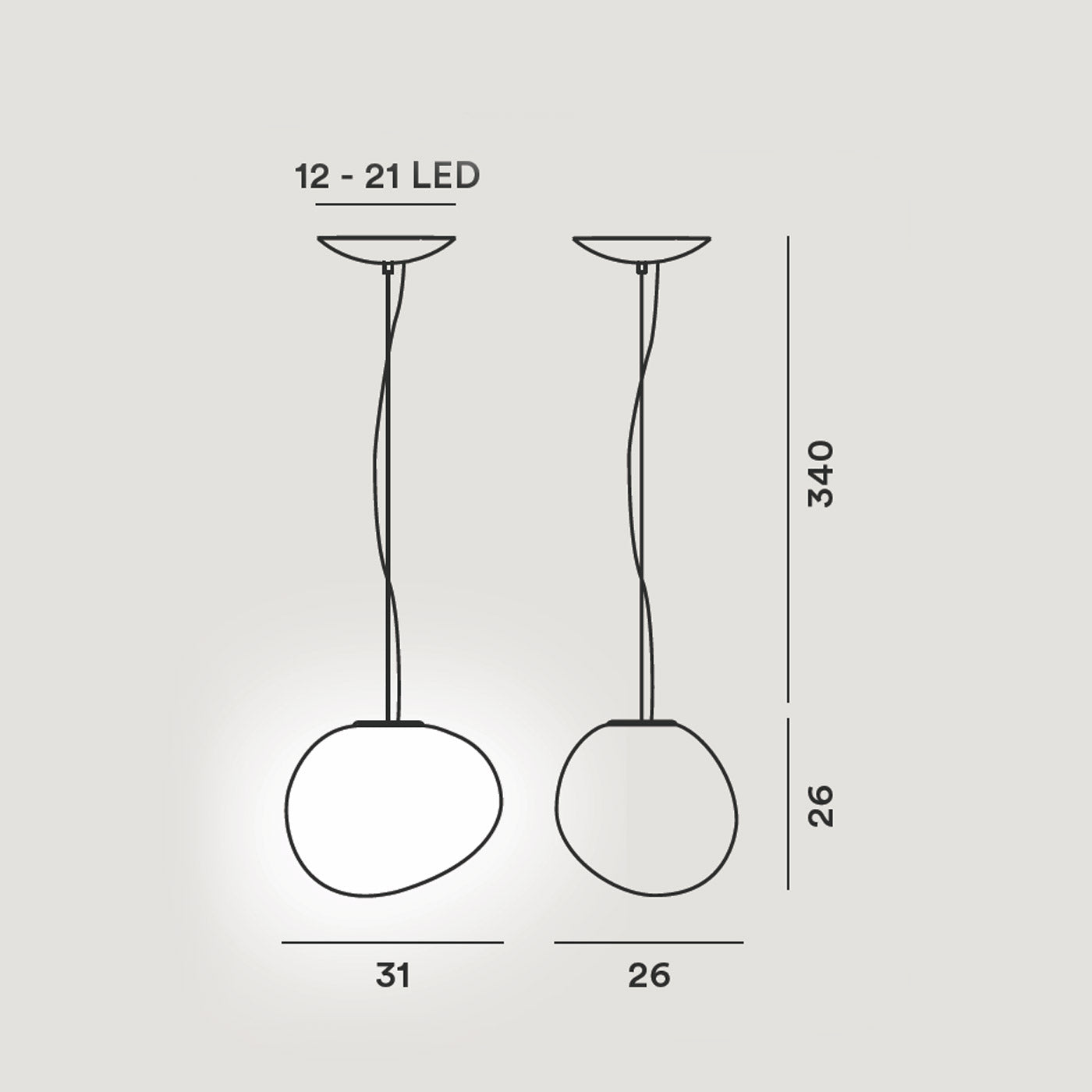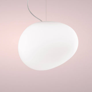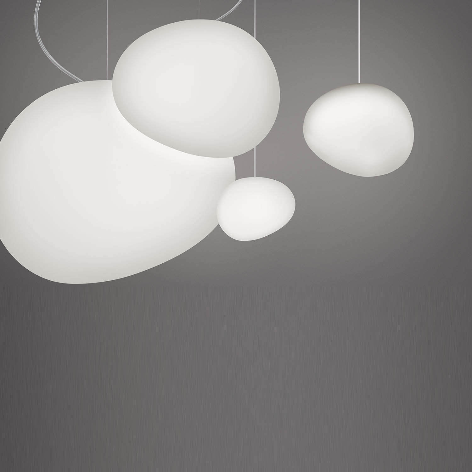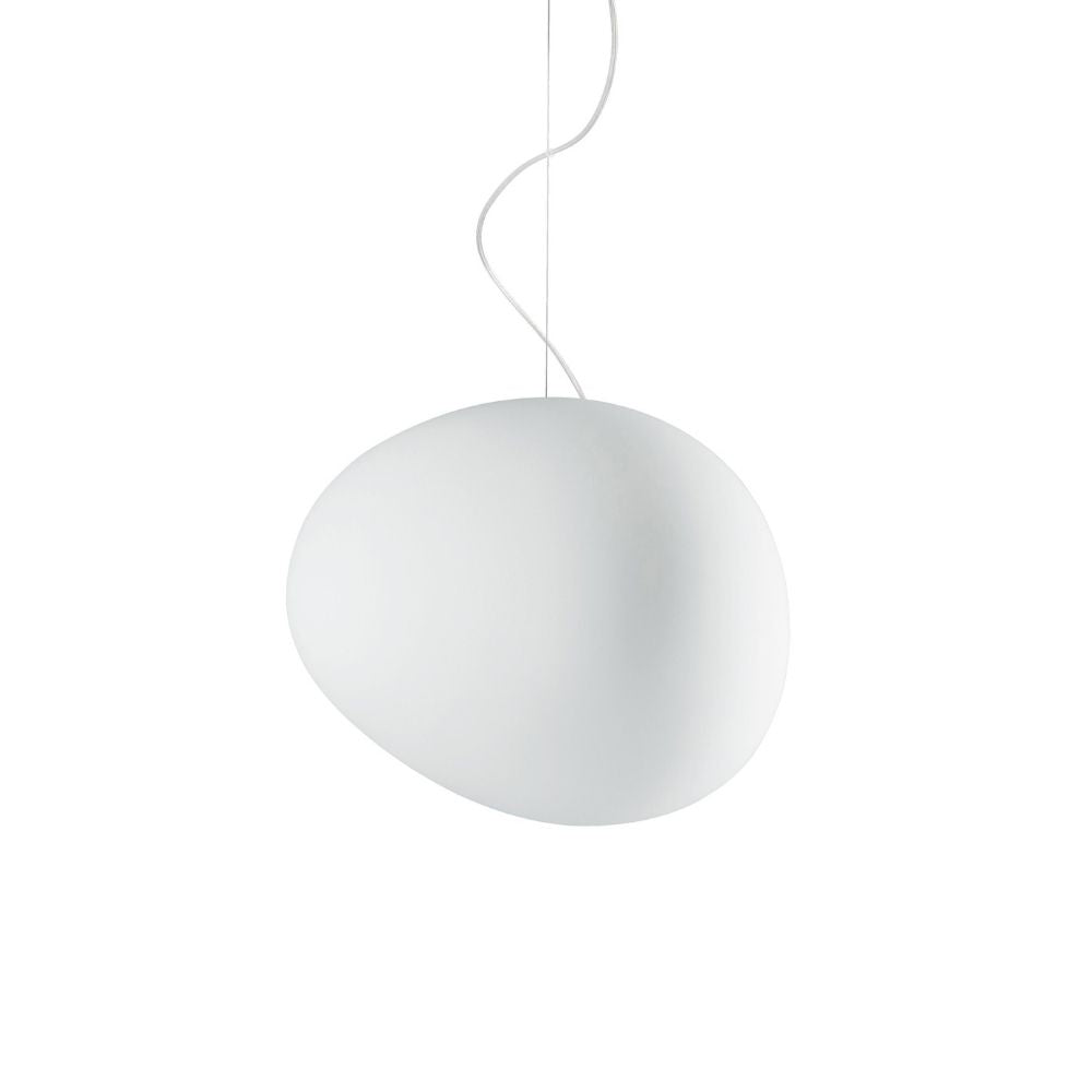 The Gregg collection, designed by Ludovico and Roberto Palomba for Foscarini, consists of a series of mouth blown glass lamps. Gregg LED medium suspension lamp is an essential and elegant element and its shape resembles that of a stone. The Gregg lamp is dimmable and emits a uniform light throughout the room, perfect to adapt to the different rooms of the house. The object is available in numerous variations.