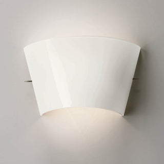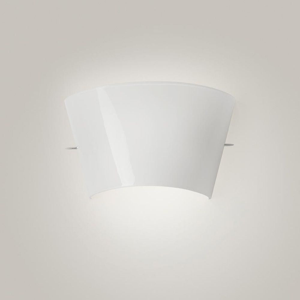 Foscarini Tutù is a white wall lamp composed of a sconce in which diffuser and frame are joined by a pin. It is characterized by a blown glass band that bends, releasing through the diffuser a warm light band on the wall. The parallel sides of the lamp have different lengths and this makes it versatile and mountable.