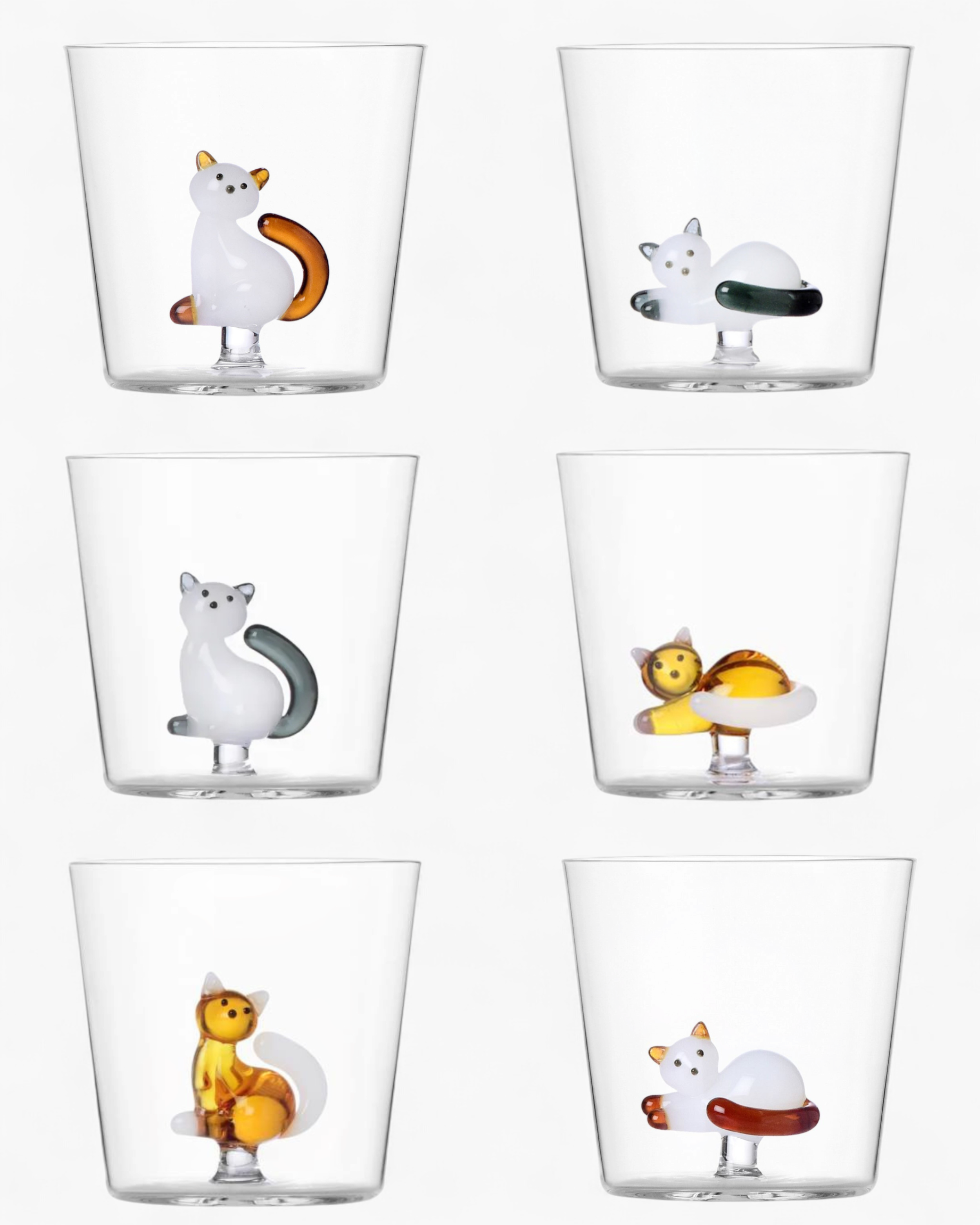 This set resonates with those seeking a set of cat tumblers that merges lighthearted spirit with the clarity and precision associated with Ichendorf Milano. The influence of Alessandra Baldereschi design can be felt in the sculptural refinement of each feline figure, giving depth and personality to objects often considered purely functional. This is animal motif drinkware, colorful handmade glasses, and a whimsical table gift set that reflects the expressive identity of the ensemble, while the craftsmanship speaks to traditions of italian borosilicate glass. For design lovers assembling a designer tumbler collection with unique charm, and for those ready to buy Tabby Cat tumbler set as a distinctive home accessory, this mix offers character, craftsmanship, and lasting enchantment.
