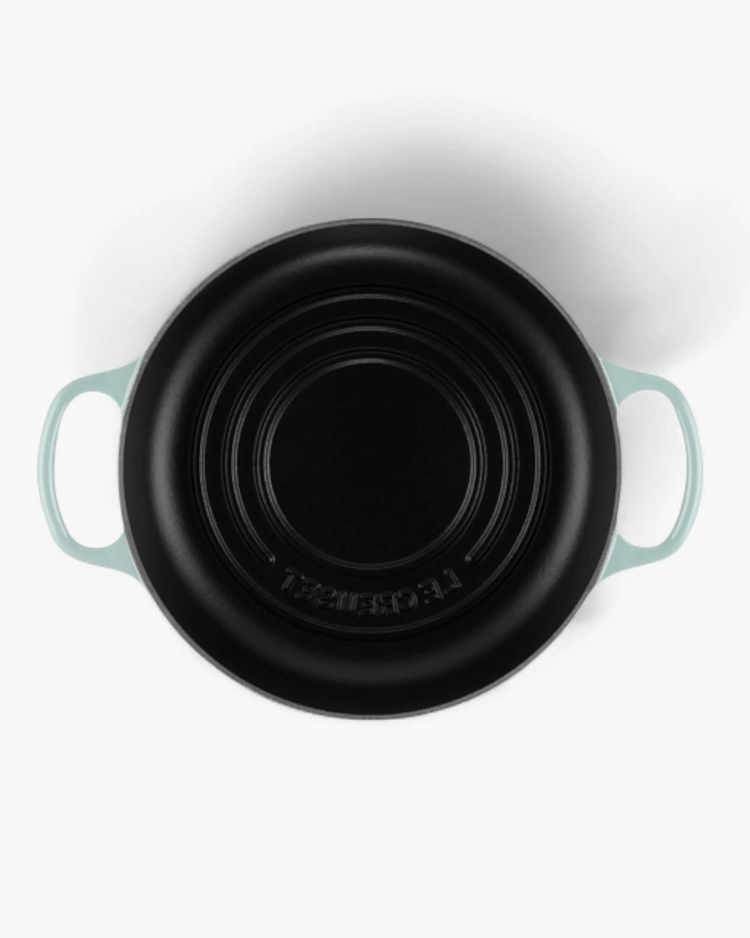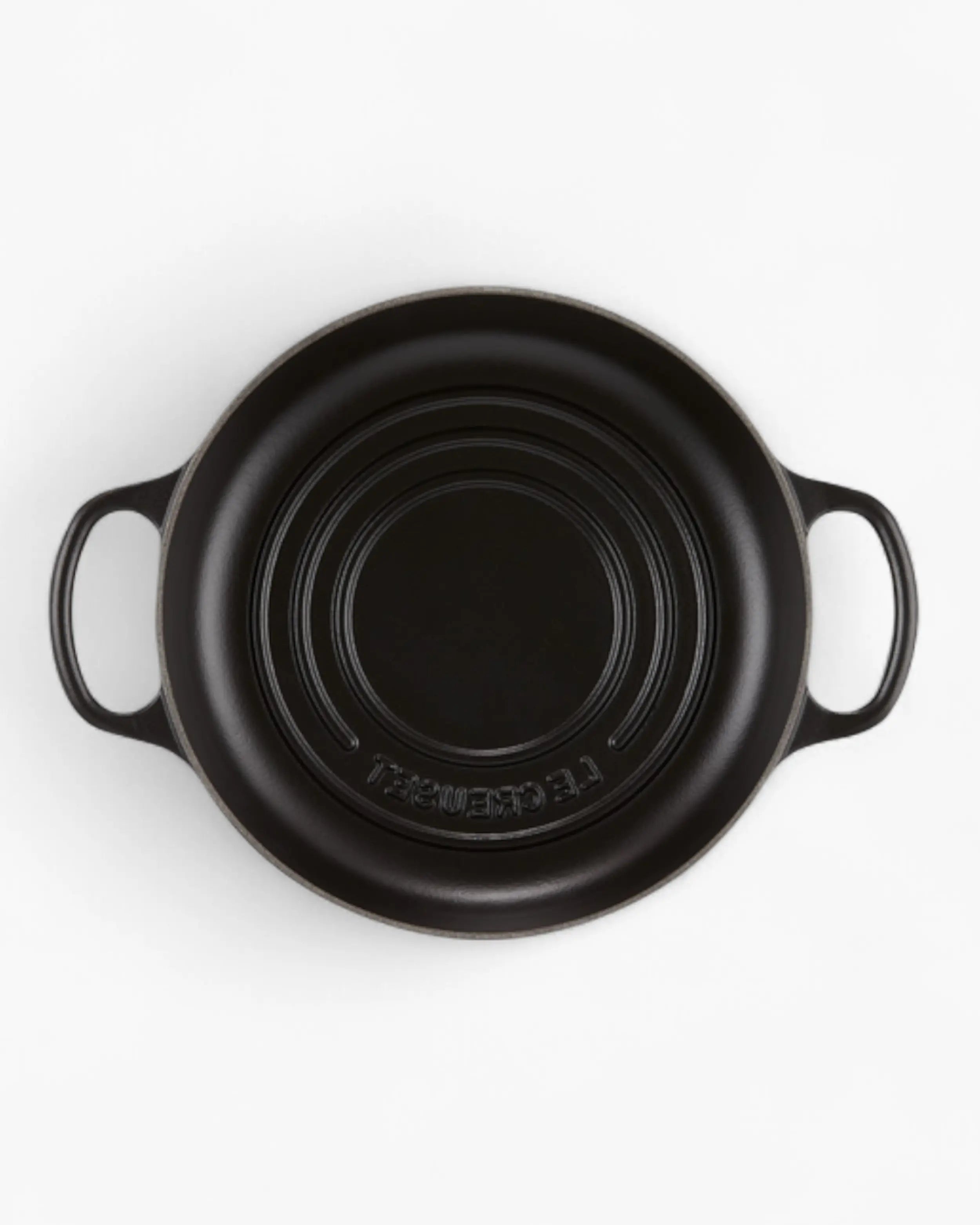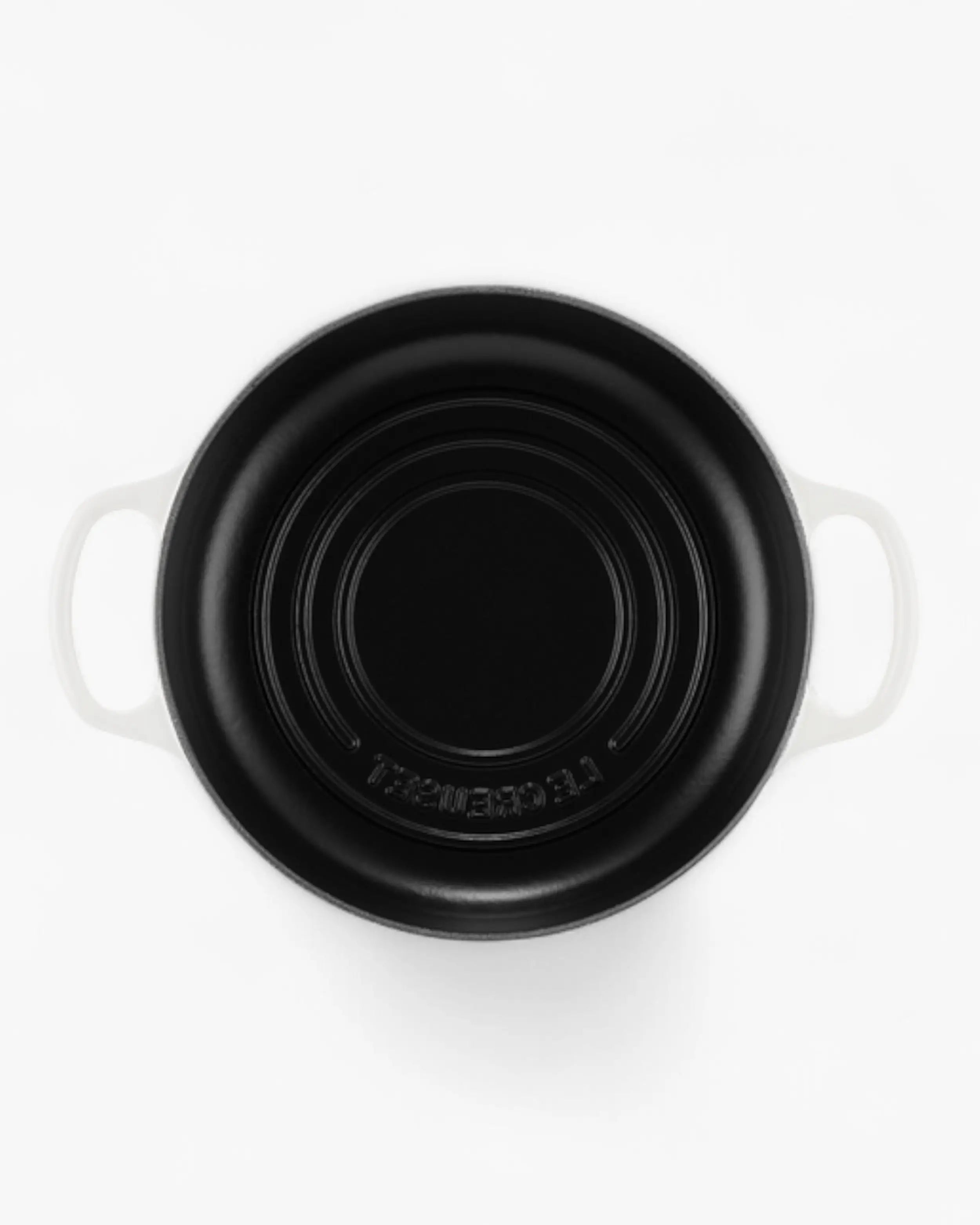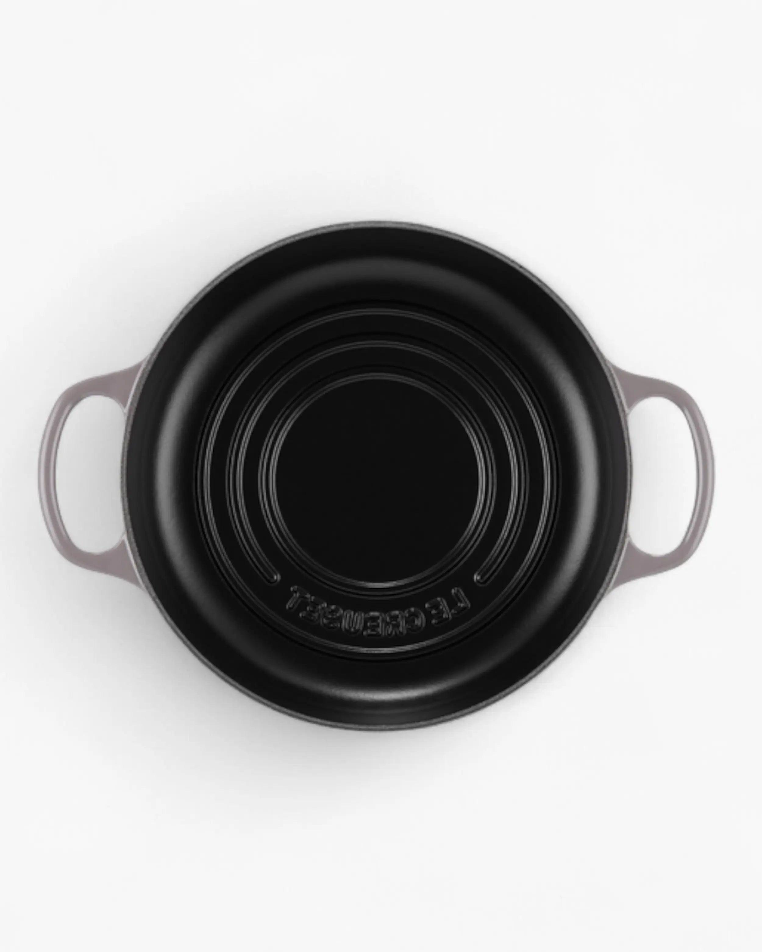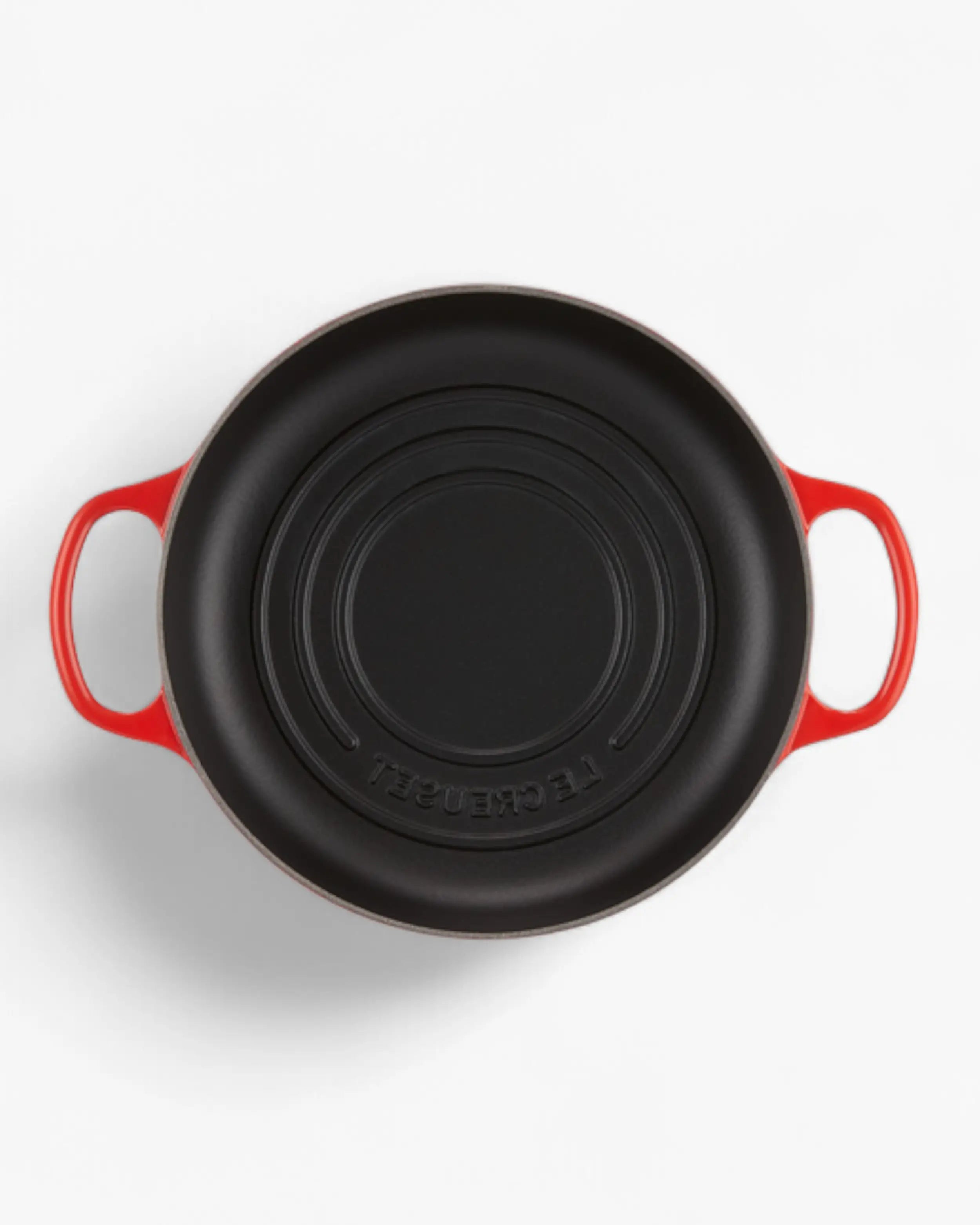 The bread oven Le Creuset is made from high-quality cast iron, providing superior heat retention and even heat distribution. Its vitrified black interior surface prevents sticking, enhances browning, and ensures easy food release, making it the ultimate tool for perfect bread baking.