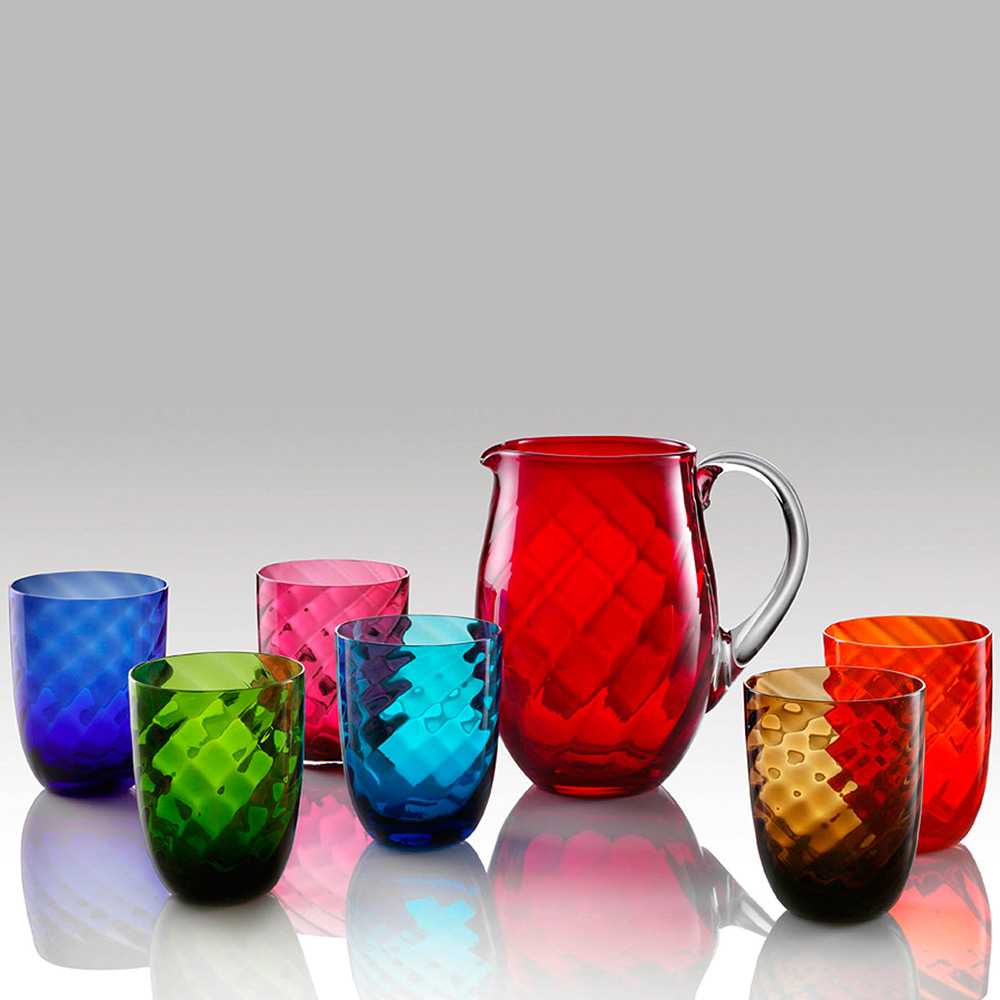 The Idra Balloton collection, conceived and produced by Nason Moretti, leading Italian brand in the production of glasses, vases and design objects handmade in Murano glass, combines textures, colors and motifs of the Murano tradition. The Idra Balloton pitcher, available in different color combinations, is ideal for serving water, wine and other beverages, giving a touch of liveliness and originality to the table.