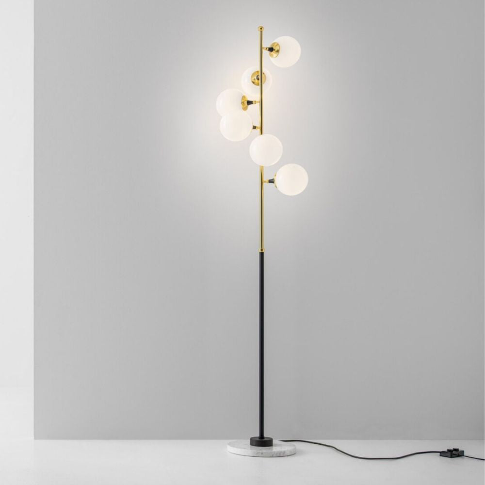 Galassia floor lamp, made by the Stilnovo brand in 1959. Galassia is a floor lamp with a very elegant and refined design that fully reflects the 1950s style. A beautiful Carrara marble base that supports a black metal and brass stem and ends with six white glass diffusers. Galaxy gives a soft light that creates a pleasant atmosphere, come and discover the entire collection on the ShopDecor website!