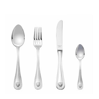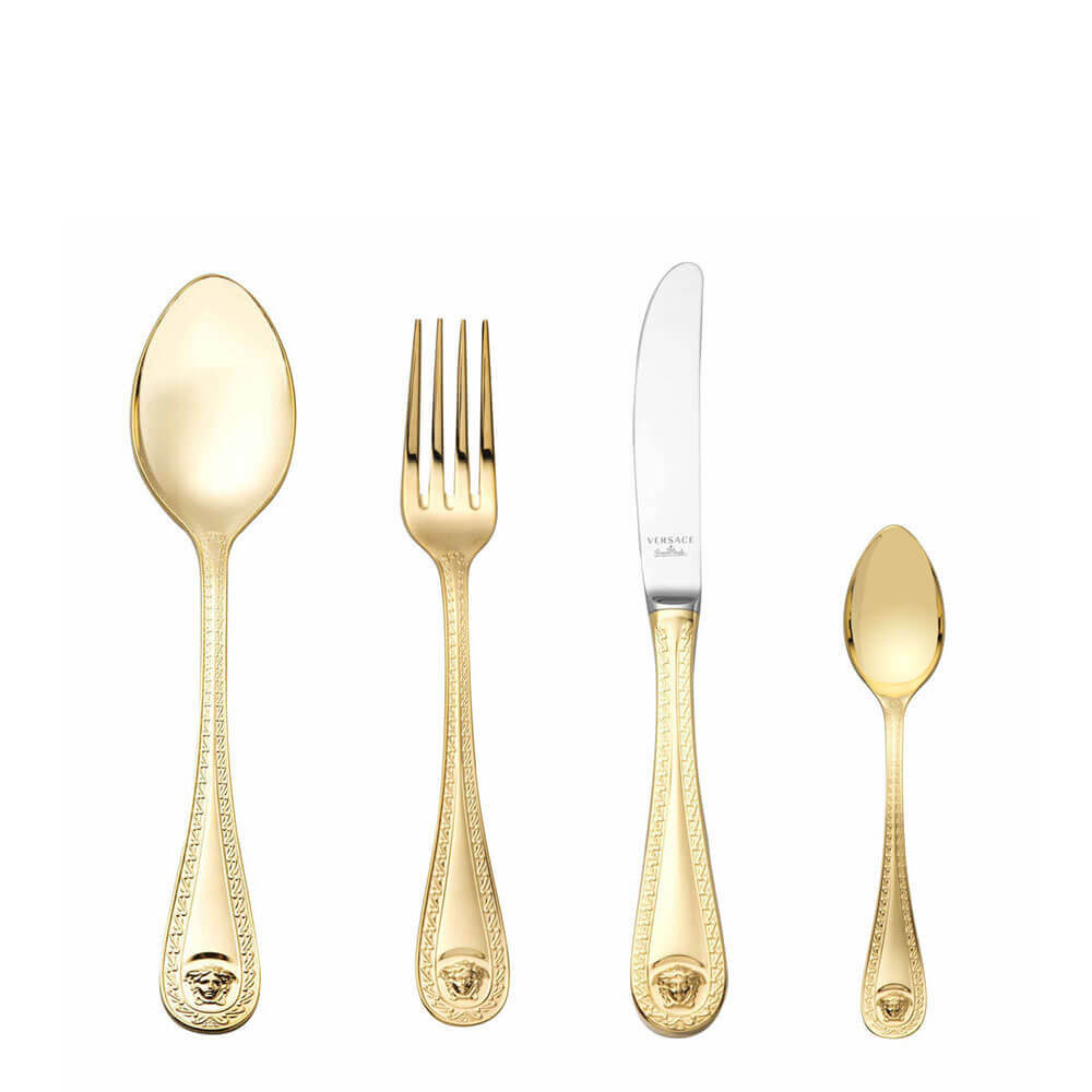 Versace Home introduces the Medusa Cutlery set of 4 cutlery, available in the gold and silver plated version and consisting of: dinner spoon, dinner fork, dinner knife and coffee spoon. Medusa Cutlery is the exclusive selection of cutlery embellished with the iconic Medusa head decoration, perfect for decorating and beautifying the table with a touch of elegant and refined style. Make every occasion special with the unmistakable art of Versace Home.