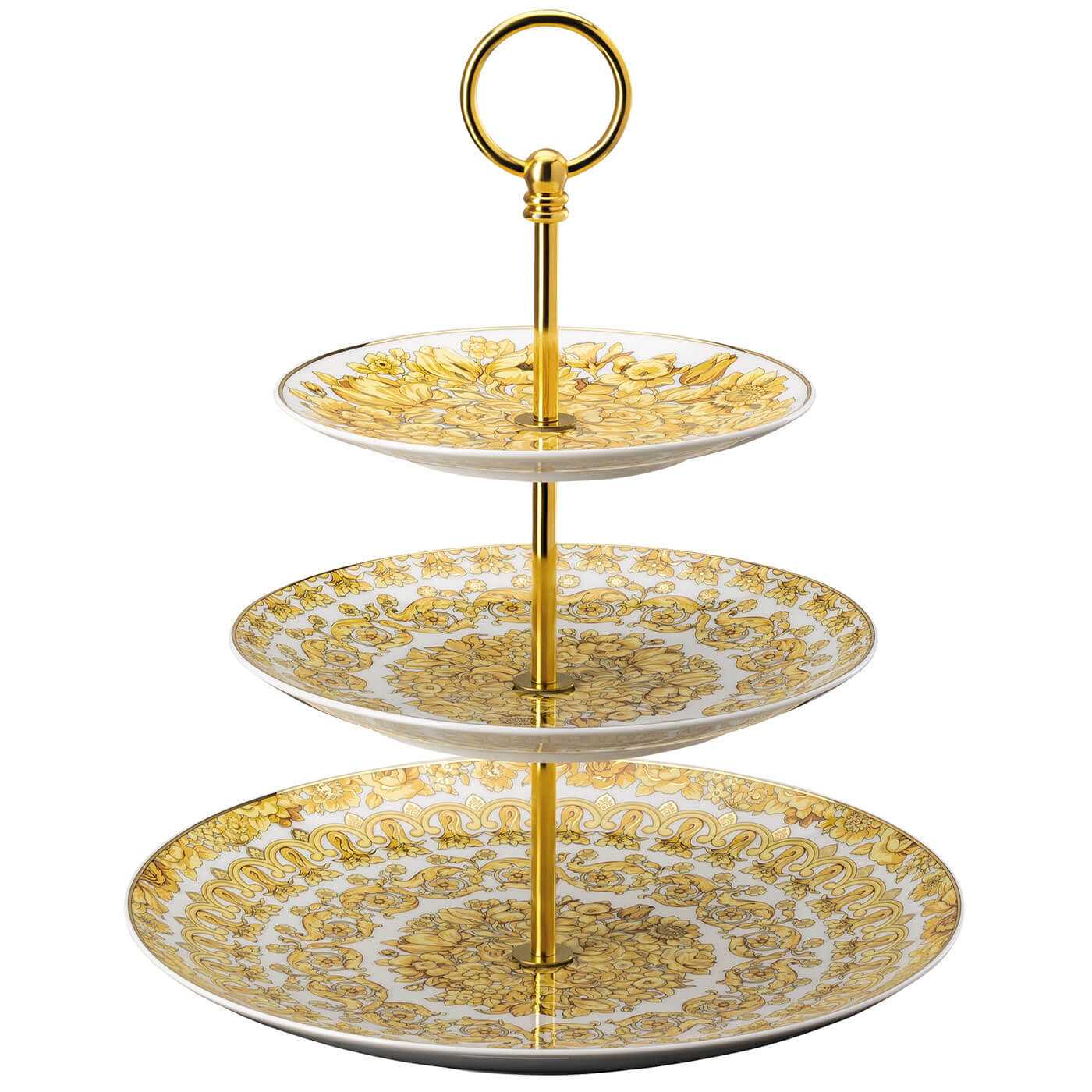 Shop Decor presents the Medusa Rhapsody etagere with 3 tiers. Featuring a gold-colored Baroque-style floral motif, the Medusa Rhapsody collection of plates, cups and other accessories is perfect for beautifying and decorating your table and home with a one-of-a-kind touch of elegance and sophistication. Make every occasion special with the unmistakable art of Versace Home.