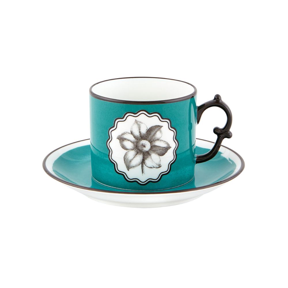 Herbariae tea cup and saucer peacock, designed by Christian Lacroix for Vista Alegre. The Herbariae tea cup and saucer peacock, finely decorated with a flower and a black border that give a touch of unique elegance thanks to the contrast of colors, is the ideal element to make your table unique. The Herbariae collection takes inspiration from five flowers (the poppy, the narcissus, the lotus, the dahlia and the thistle) and makes them protagonists of the entire line representing them in the style of ancient herbariums and combining them with soft colors, thus evoking a watercolor effect. Discover the entire Herbariae collection and make every occasion unique.