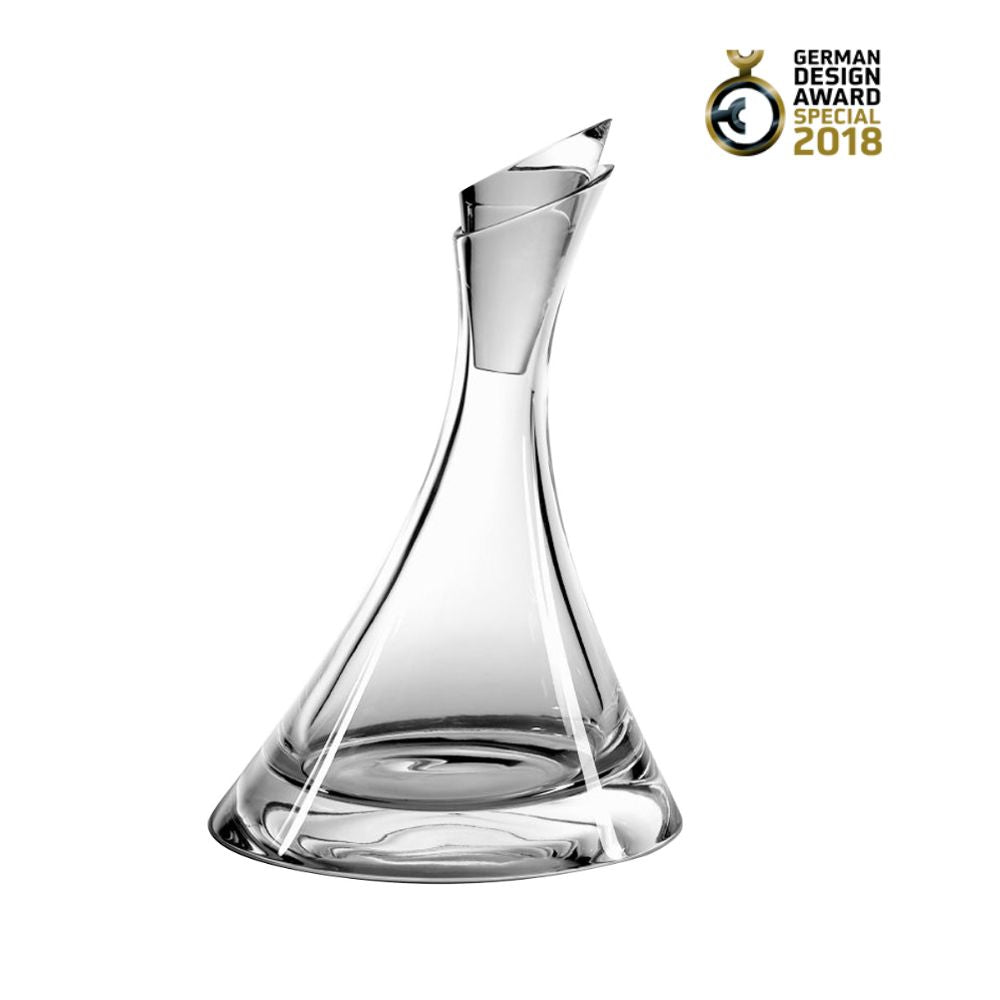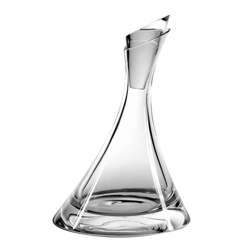 Oz wine decanter, designed and produced by Vista Alegre. The Oz wine decanter, elegantly inclined and with a unique silhouette, is the modern reinterpretation of the classic decanter. The sinuous and minimalist lines combined with the sheen of the crystal create a spectacular contrast with the wine tones inside, transforming the Oz decanter into a unique design table accessory.