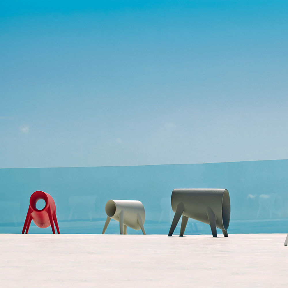 Eugeni Quitllet creates VONDOM’s BUM BUM collection as an homage to the waves of the sea, to music and sound. All that is soft and pleasing in this world converge in the sinuous shapes of BUM BUM series: their hollow shape is inspired to those shells in which you can hear the sound of the ocean. BUM BUM collection is made up of a sofa, a table, an armchair and a stool, and each one seems to have been smoothed by waves of the sea to create ergonomic and embracing shapes. When their different forms and colours are combined together, BUM BUM’s elements create unique and innovative atmospheres, a colourful underwater world directly in your indoor and outdoor ambiences. The pieces of BUM BUM collection are available in colours white, black, ecru, bronze and red. Here we propose you BUM BUM TORO, the outdoor stool whose shape reminds of a shell, made of matte embossed polypropylene. The bull” is an original and versatile piece of furniture that can absolve different aesthetical and functional tasks.
