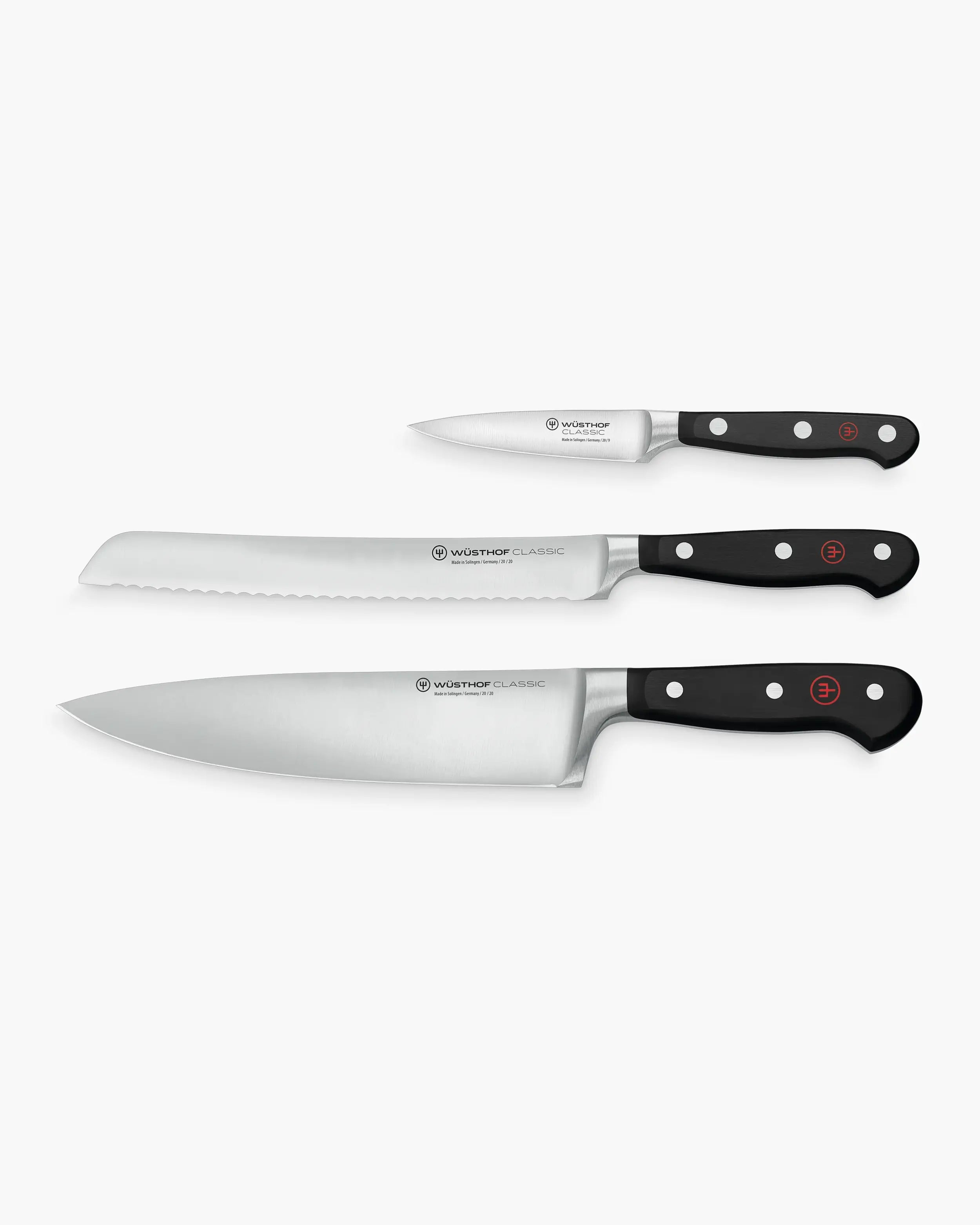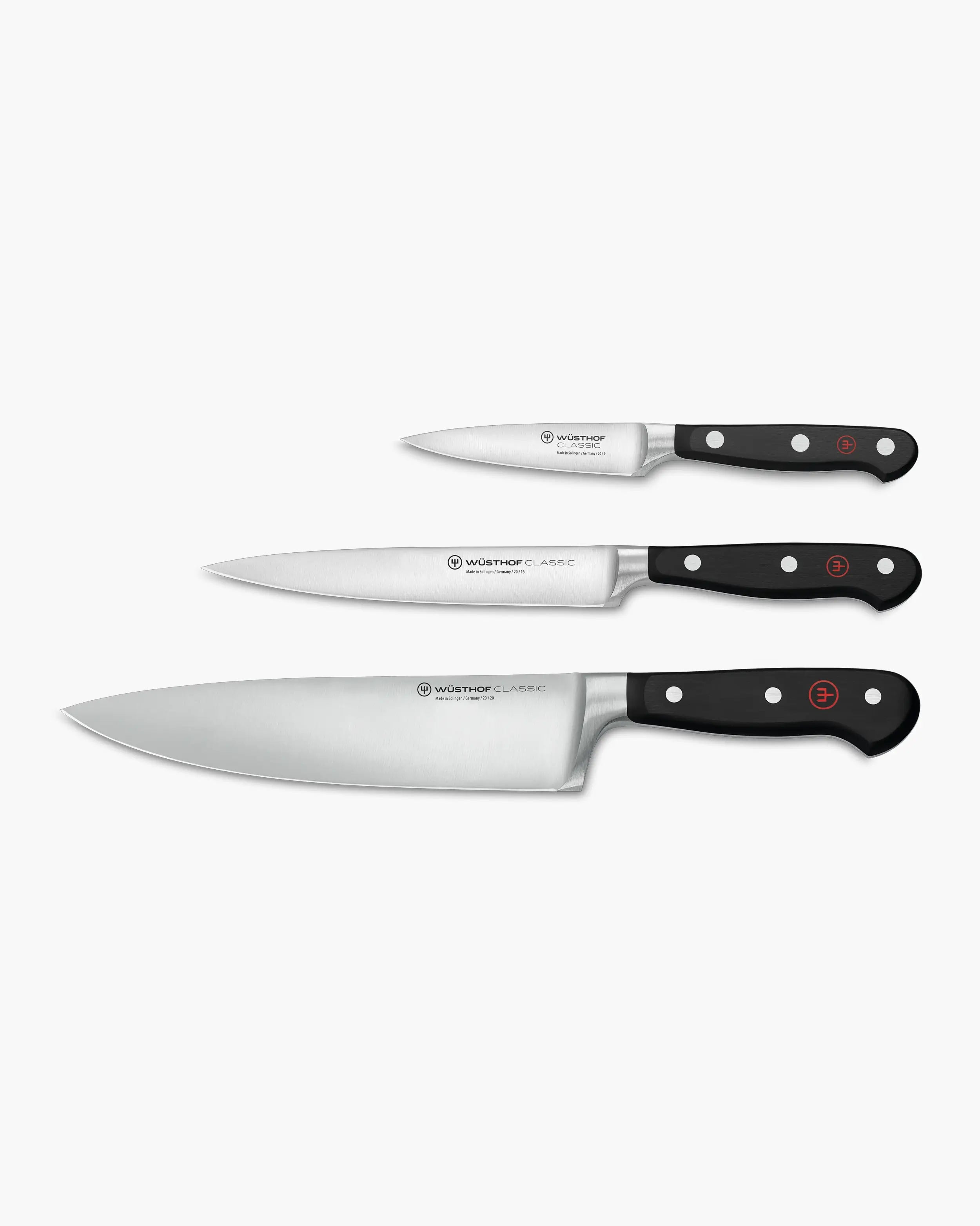 The wusthof classic 3 piece knife set includes a 20 cm cook’s knife, a 16 cm wusthof classic carving knife, and a 9 cm wusthof classic paring knife. Whether you're dicing vegetables, carving roasts, or peeling delicate fruits, these classic knives by Wüsthof give you control, comfort, and precision in every task. Each knife is hand-sharpened, perfectly balanced, and designed to handle your daily culinary rituals with elegance, as well as all wusthof knife sets do.