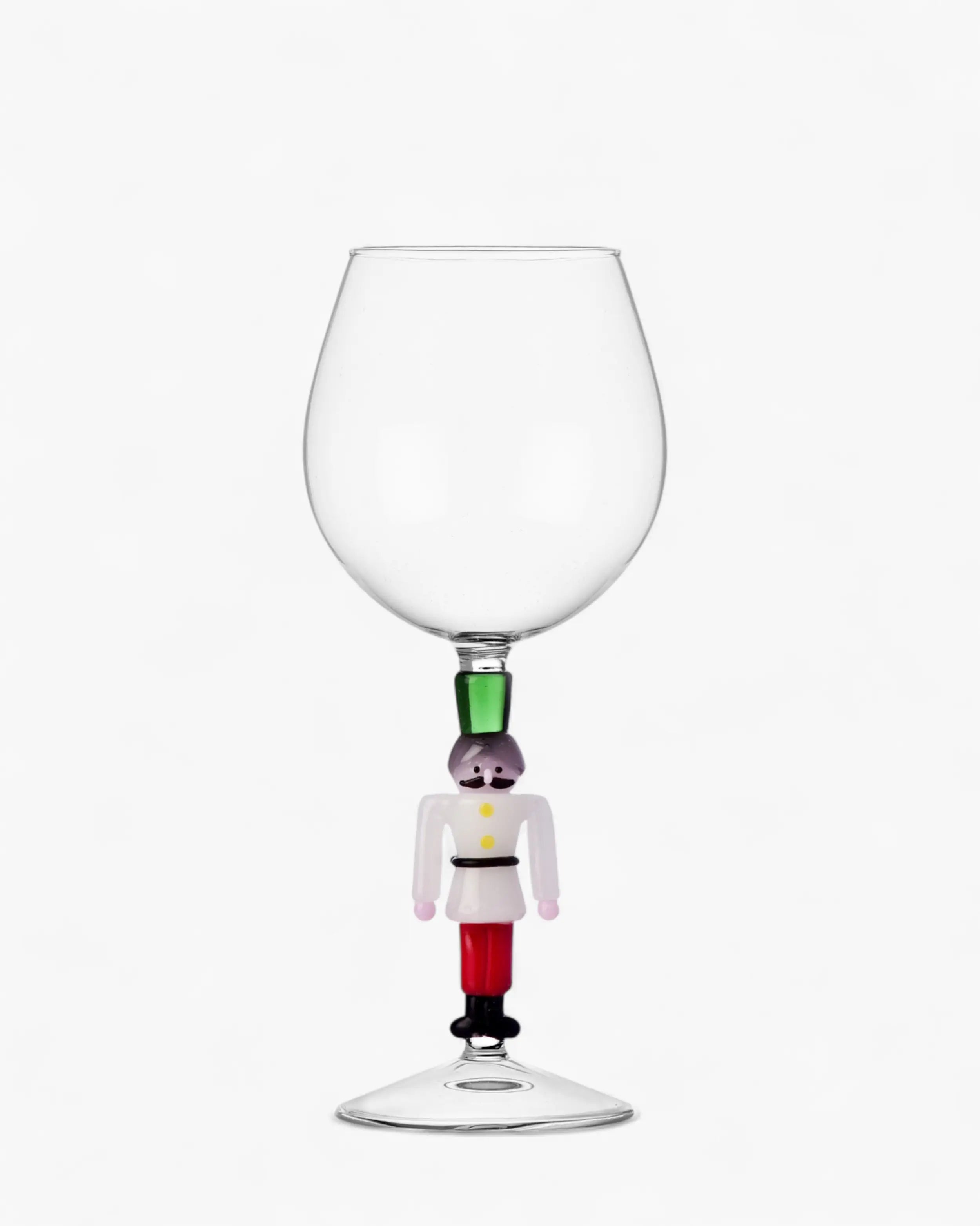 Parte da coleção Schiaccianoci, inspirada no famoso balé Quebra-Nozes, este cálice Ichendorf transforma a mesa num palco. O soldado, guardião da tradição e símbolo de força, torna-se parte integrante do ritual da refeição. Os artesãos criam cada figura através da técnica de lampworking, um processo delicado que assegura diferenças subtis entre as peças. Estas variações tornam cada copo único, tal como uma performance que nunca pode ser repetida exatamente da mesma forma. Um complemento refinado para a Louça de Mesa, combina funcionalidade e narrativa.Para mesas festivas e mais além