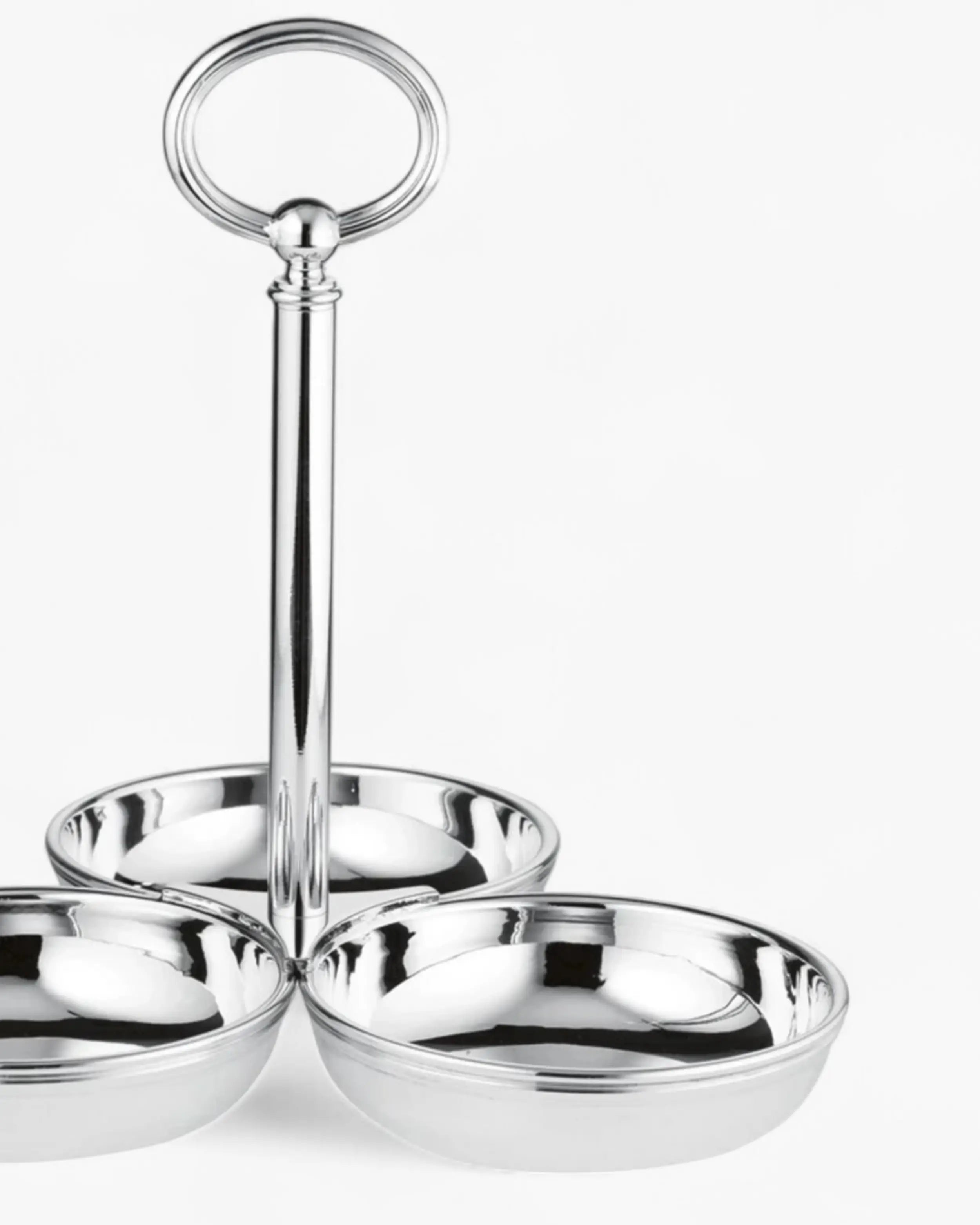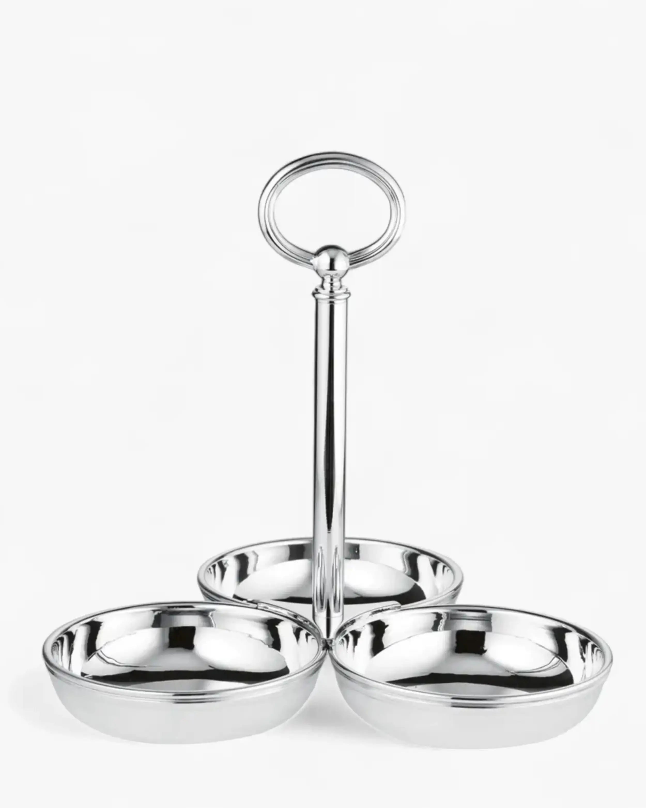 Ideal para aperitivos casuais ou receções formais, este servidor de snacks permite uma apresentação versátil, desde azeitonas marinadas e bolachas artesanais a amêndoas trufadas, tapenades ou sobremesas delicadas. A simetria equilibrada do design de três tigelas adiciona ritmo e intenção à disposição da mesa, enquanto o prateado reflexivo realça a cor e a textura de cada ingrediente.