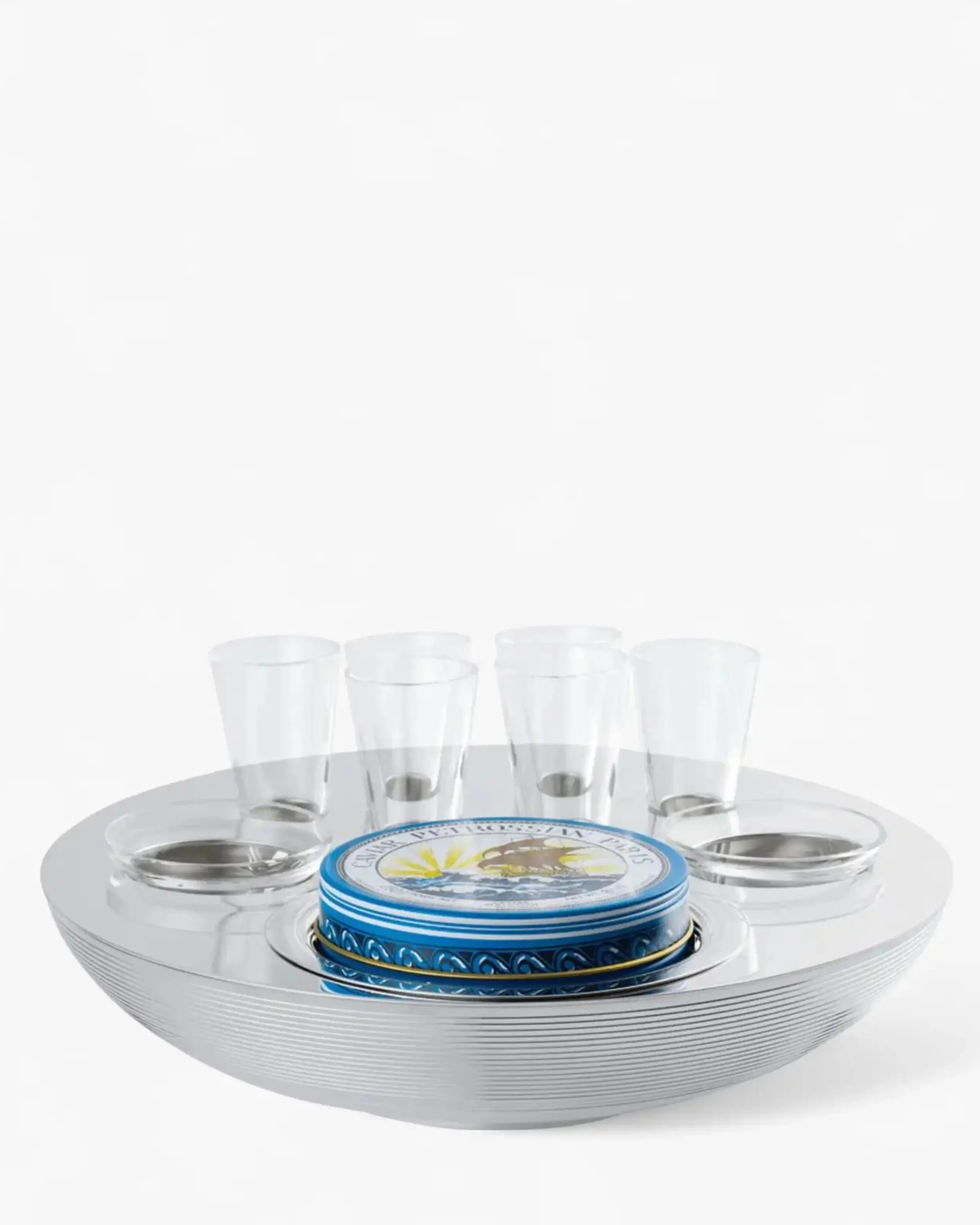 Este conjunto acomoda seis copos individuais de vodka. A base polida é proporcionada para estabilidade e equilíbrio, permitindo o serviço simultâneo a vários convidados sem comprometer a apresentação. É ideal para receções elegantes, degustações privadas ou eventos culinários curados onde cada detalhe importa.