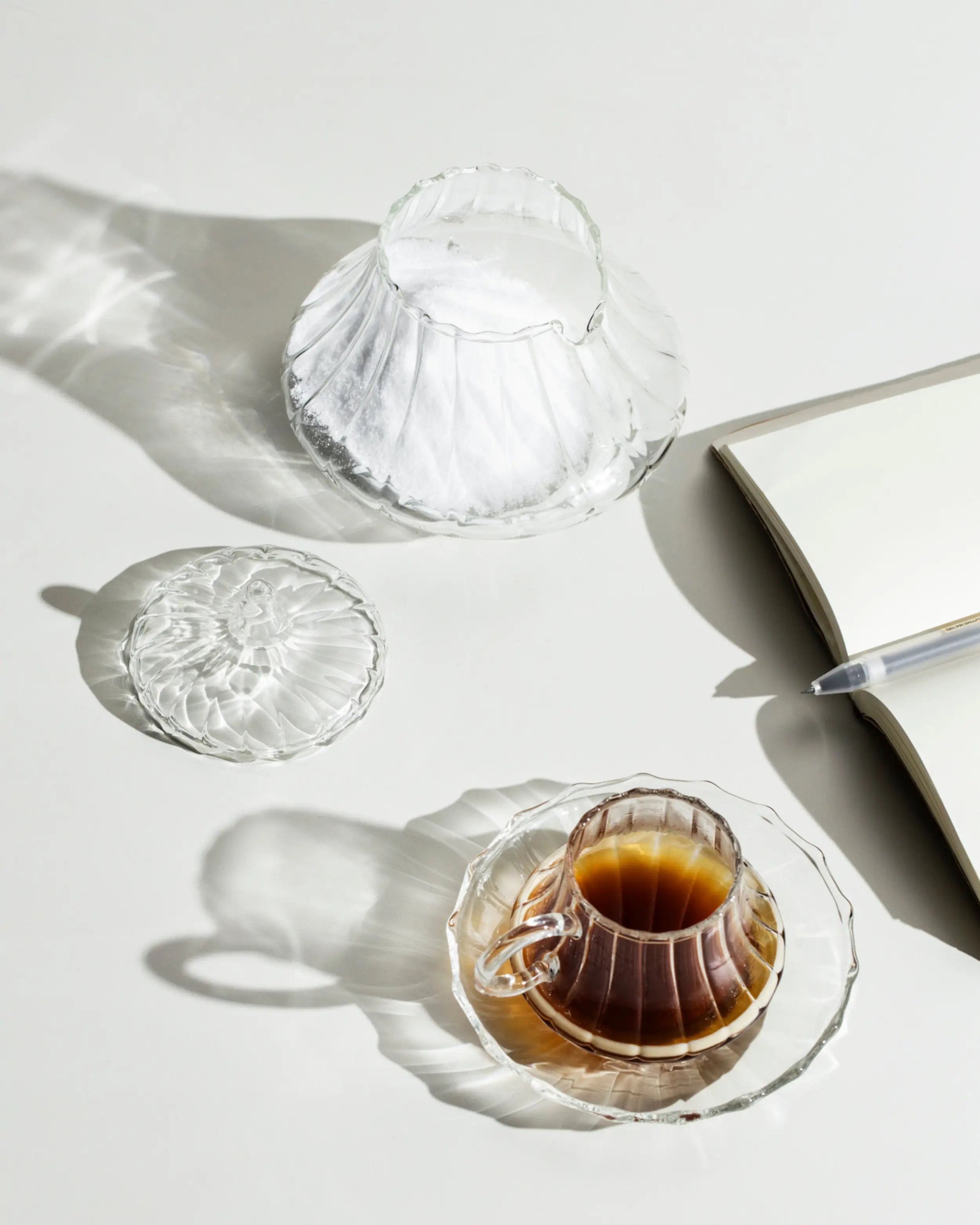Cada elemento desta chávena é cuidadosamente pensado para melhorar a experiência diária. O vidro fino mas resistente confere ao objeto uma leveza surpreendente, enquanto o pires completa o conjunto com equilíbrio e praticidade. Pode ser lavado na máquina de lavar louça a baixas temperaturas, mantendo o seu brilho ao longo do tempo, demonstrando como a elegância e a utilidade podem coexistir. Ao segurá-la na mão, percebe-se o prazer tátil do vidro: suave, luminoso e fresco ao toque; qualidades que transformam um simples espresso num gesto requintado.
