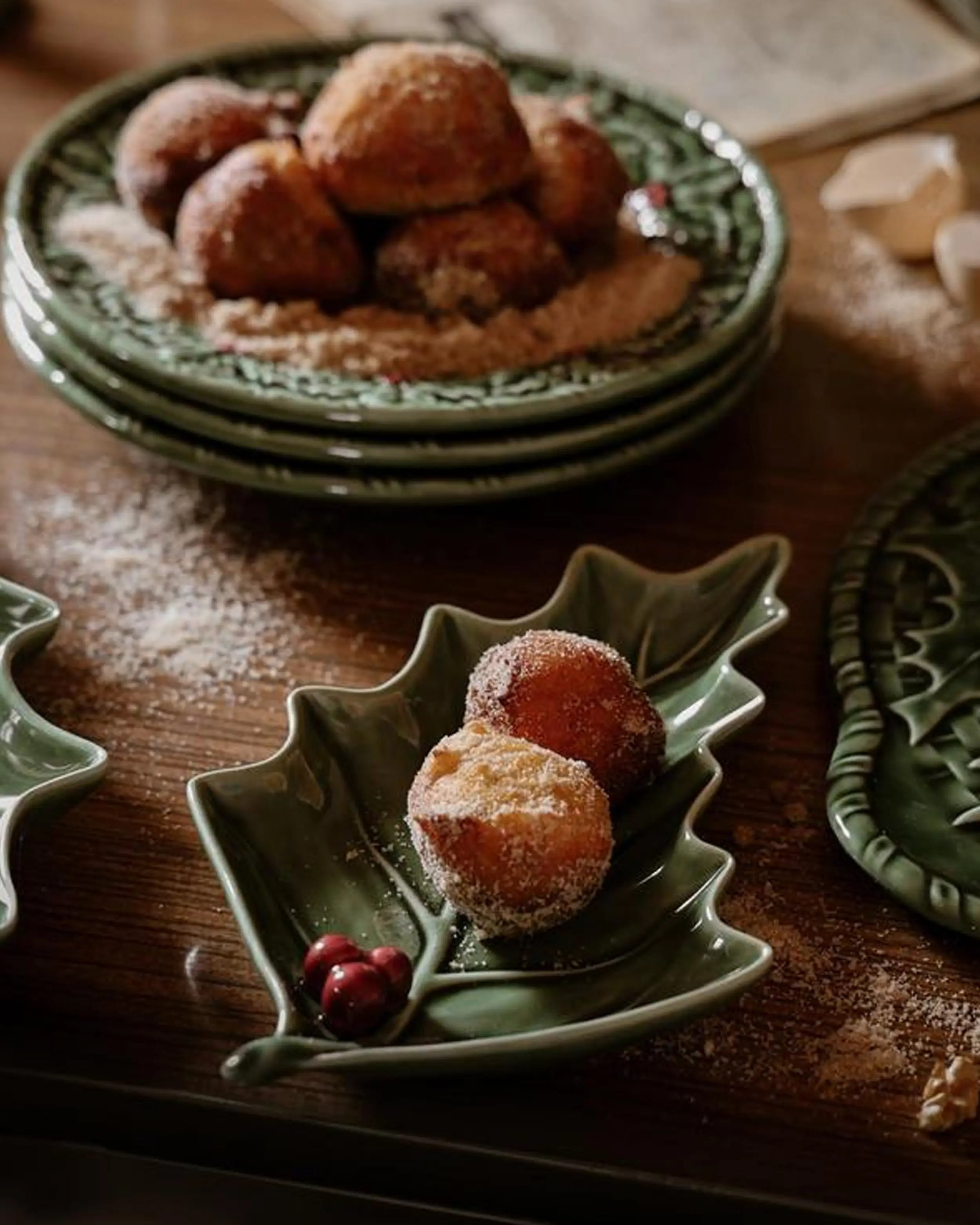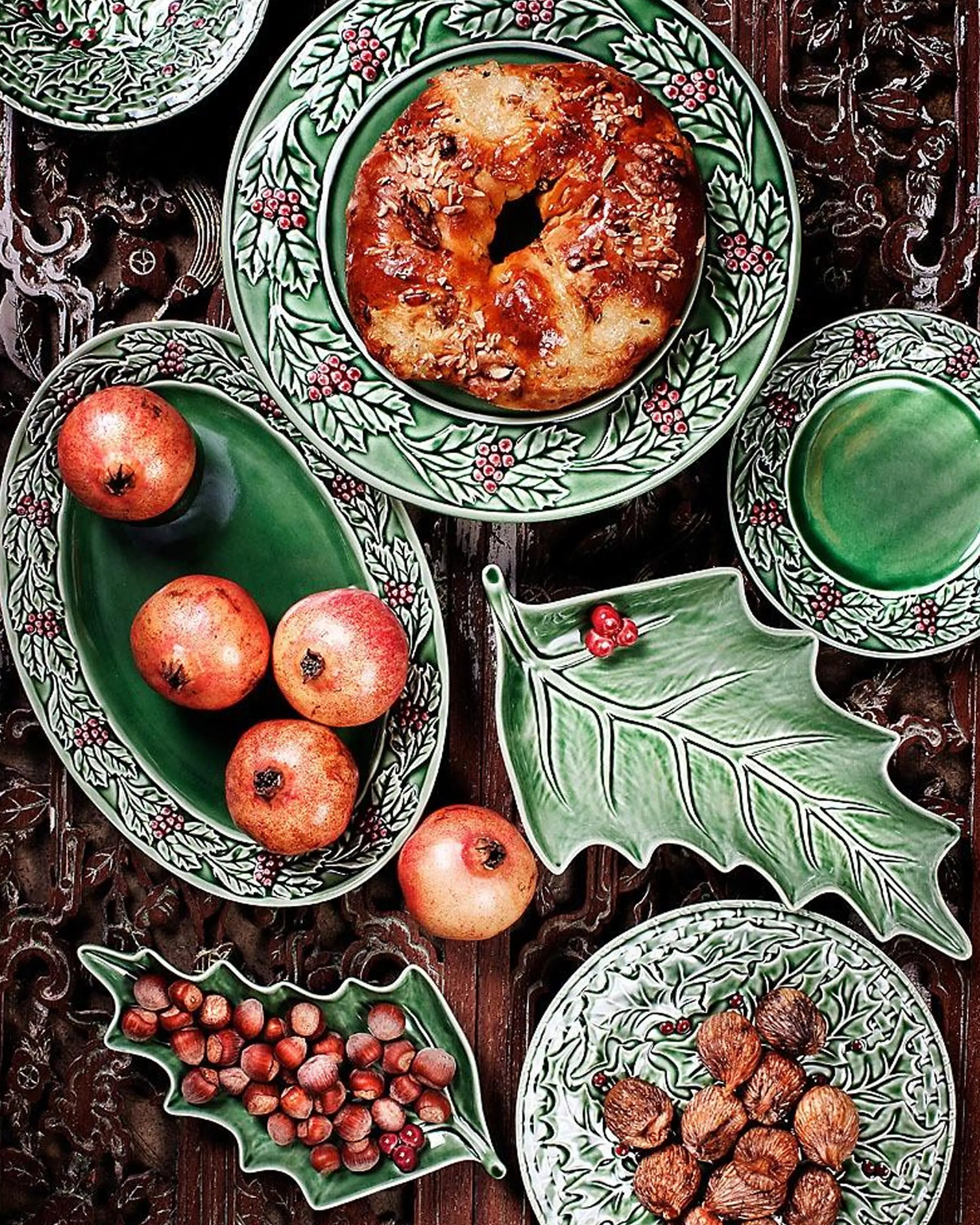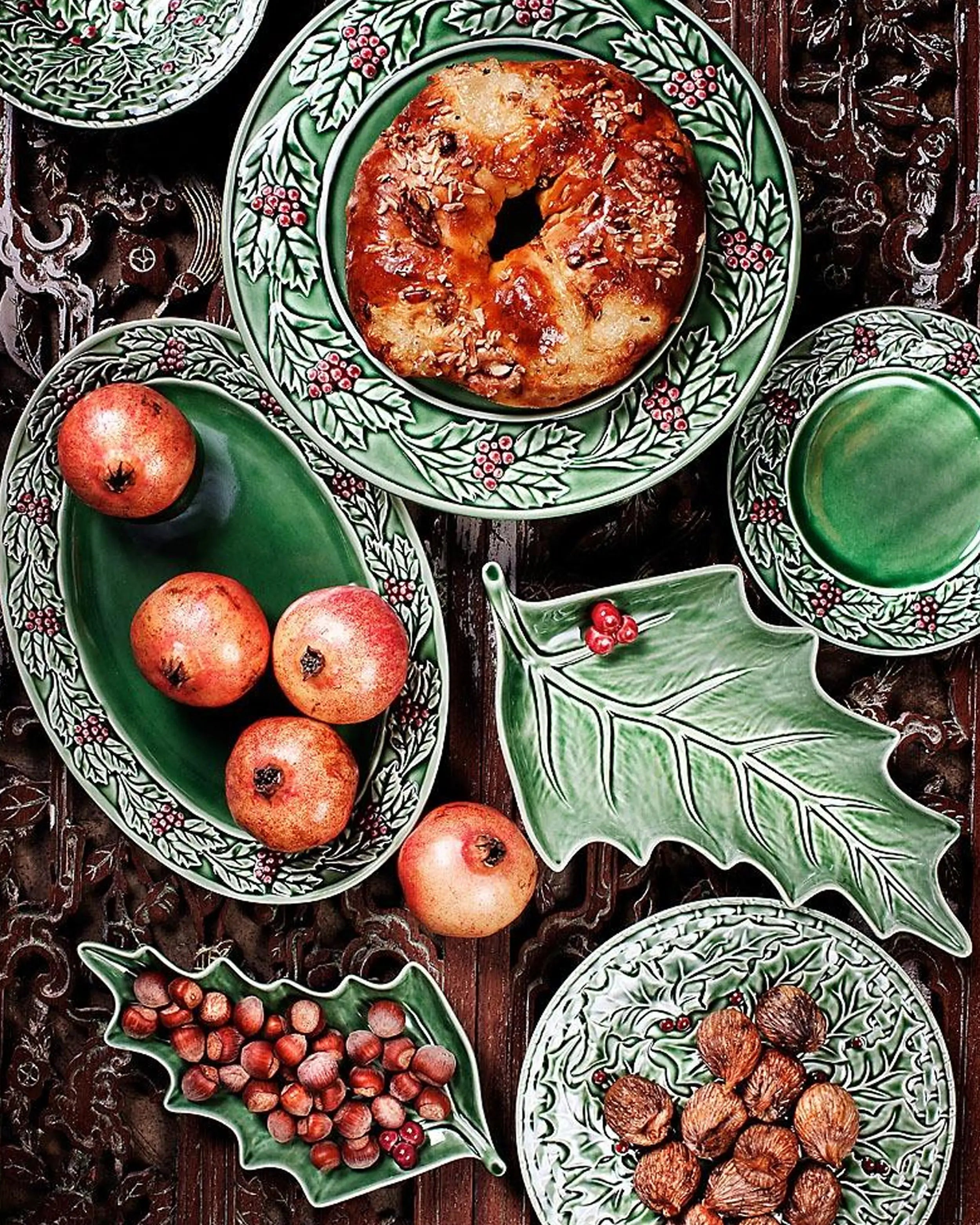A Bordallo Pinheiro Holly/Azevinho leaf traz a natureza para a mesa festiva, transformando um simples prato num objeto de design escultórico. As suas folhas verdes pintadas à mão e as bagas vermelhas brilhantes são modeladas com relevo realista, criando uma peça que funciona tanto como um prato prático como um elemento decorativo. Inspirado na resiliência do azevinho, este design simboliza renovação e celebração em forma de cerâmica.