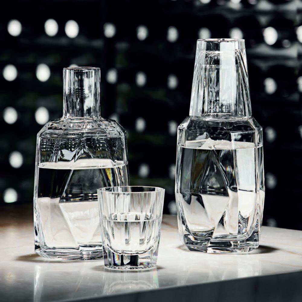 Conjunto de água Bimini, feito pela marca de design Vista Alegre . O nome Bimini vem de uma ilha paradisíaca localizada nas Bahamas. Diz a lenda que a fonte da juventude se originou aqui, um símbolo de pureza. O resultado é um conjunto composto por uma garrafa e um copo de água feito de vidro e cristal, um design simples, moderno e elegante.