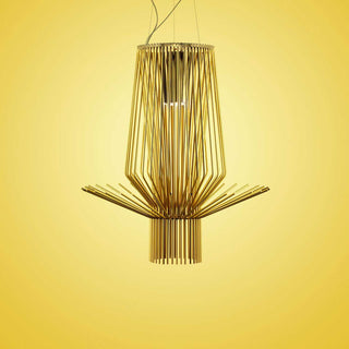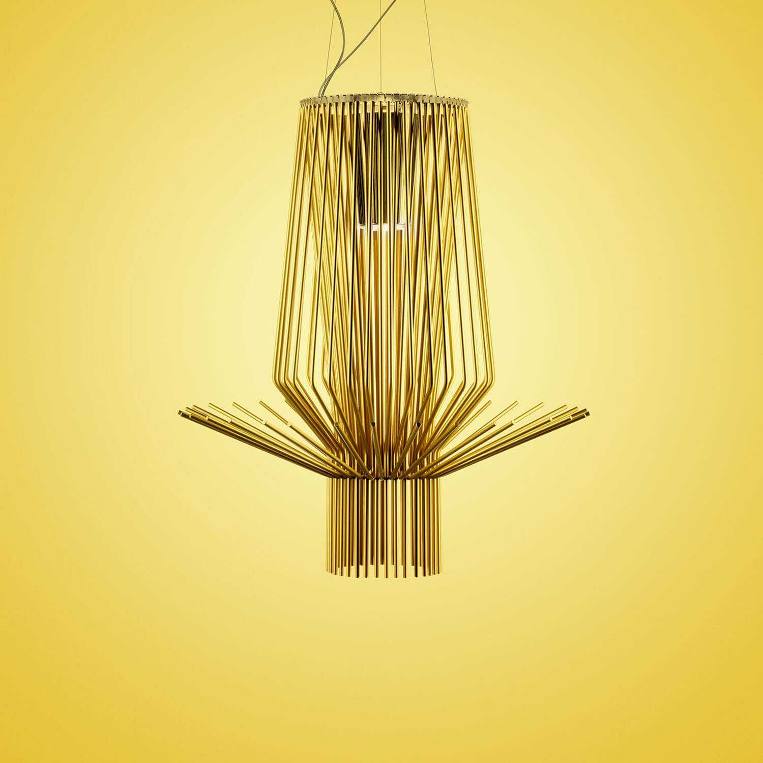 Allegretto Assai gold é uma luminária suspensa projetada pelo Atelier Oï para Foscarini , com um estilo único e dinâmico. Allegretto, que faz parte do projeto Allegro, é feita com linhas metálicas que circundam a fonte de luz, criando reflexos sugestivos nas paredes. A luminária Allegretto Assai é um símbolo de charme e harmonia e imediatamente captura a atenção em qualquer ambiente.