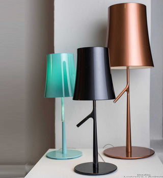 O pequeno abajur Birdie em cores diferentes, projetado pelos designers Ludovica e Roberto Palomba para Foscarini , é inspirado no abajur clássico com um toque moderno. O abajur emite uma luz difusa e voltada para baixo, para criar um jogo delicado e elegante de luz e sombra no espaço. O abajur Birdie apresenta um sistema de ignição touch-dimmer projetado no formato de um galho pronto para receber um pássaro: uma associação suave ao nome do objeto.