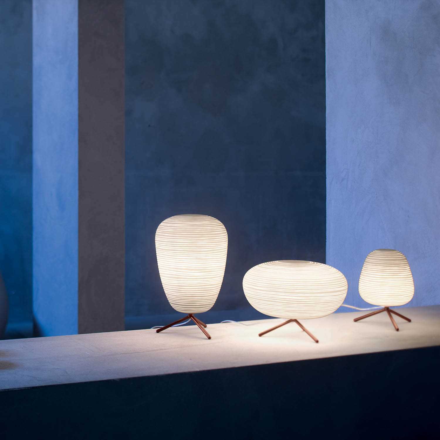 As luminárias de mesa Rituals, projetadas por Ludovica e Roberto Palomba para Foscarini , são inspiradas nas evocativas lanternas japonesas. A luminária Rituals XL, em vidro soprado e metal pintado, ilumina todos os cômodos com uma luz difusa. A superfície da luminária é decorada por linhas horizontais em relevo que refletem a luz de dentro para fora com intensidade diferente, para criar uma luz delicada e envolvente nos arredores.