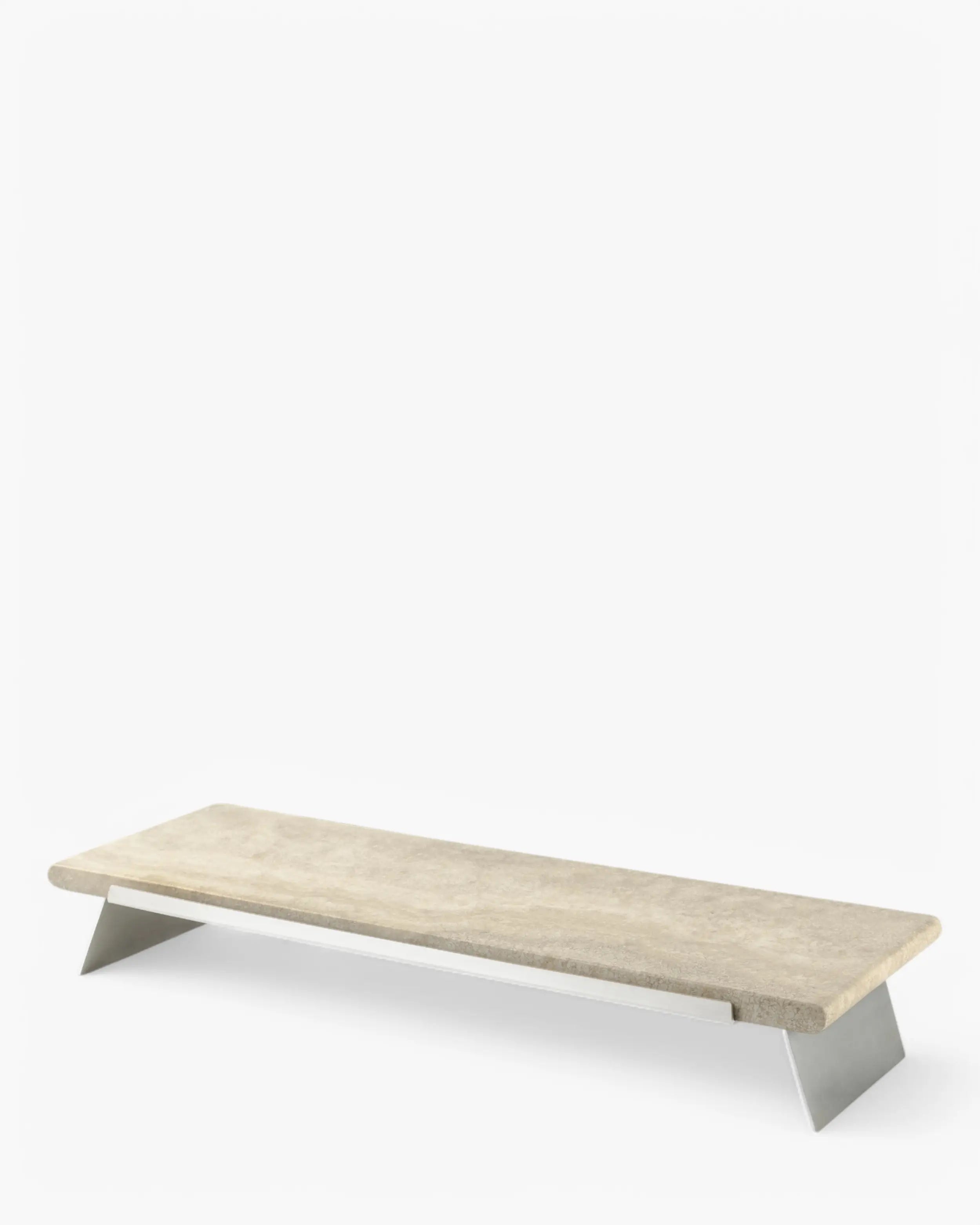 Fabricado com uma base elegante em alumínio e encimado por madeira de nogueira rica, este Centerpiece incorpora a harmonia do luxo tátil e da força arquitetónica. Projetado para uso alimentar, é perfeito para servir queijos, charcutaria, sobremesas ou amuse-bouches de uma forma que torna cada dentada numa experiência curada. A sua superfície em madeira celebra o grão e o calor da natureza, enquanto a fundação metálica minimalista introduz um contraste contemporâneo, tornando-o uma adição intemporal tanto para mesas rústicas como modernas.