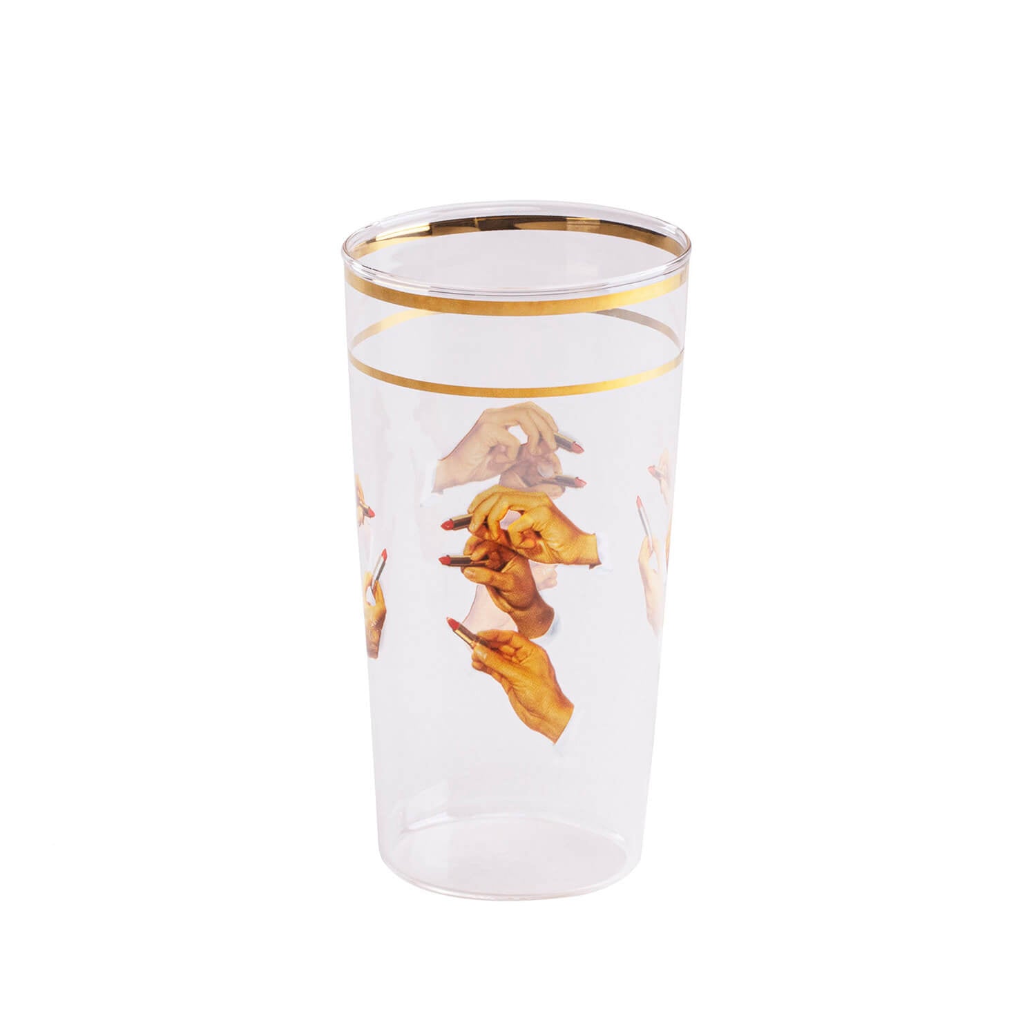 This designer drinking glass is part of the Toiletpaper Home Tableware collection, a series where table objects become artistic gestures. There is an irreverent family of patterns that includes Tongue, Hands with Snakes, Roses, Lipsticks, Shit, and Snakes; each carrying the unmistakable signature of Cattelan & Ferrari. The contrast between pop imagery and fine materials perfectly captures the duo’s creative philosophy: elegance should never take itself too seriously. The result is a graphic print glass that stands at the crossroads between art and utility.