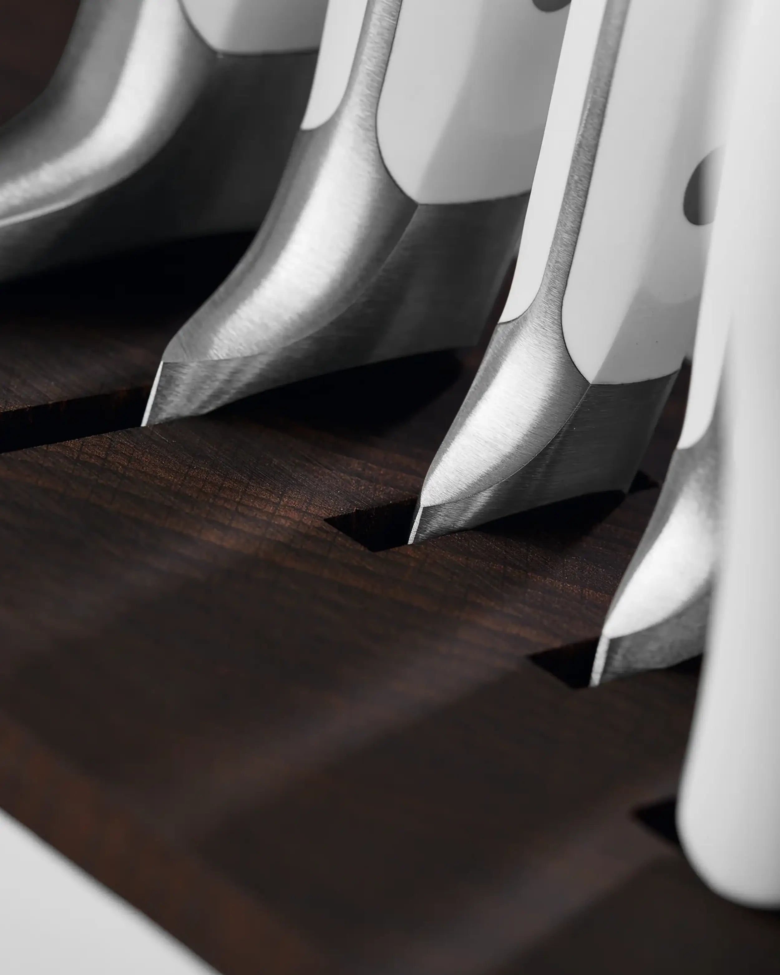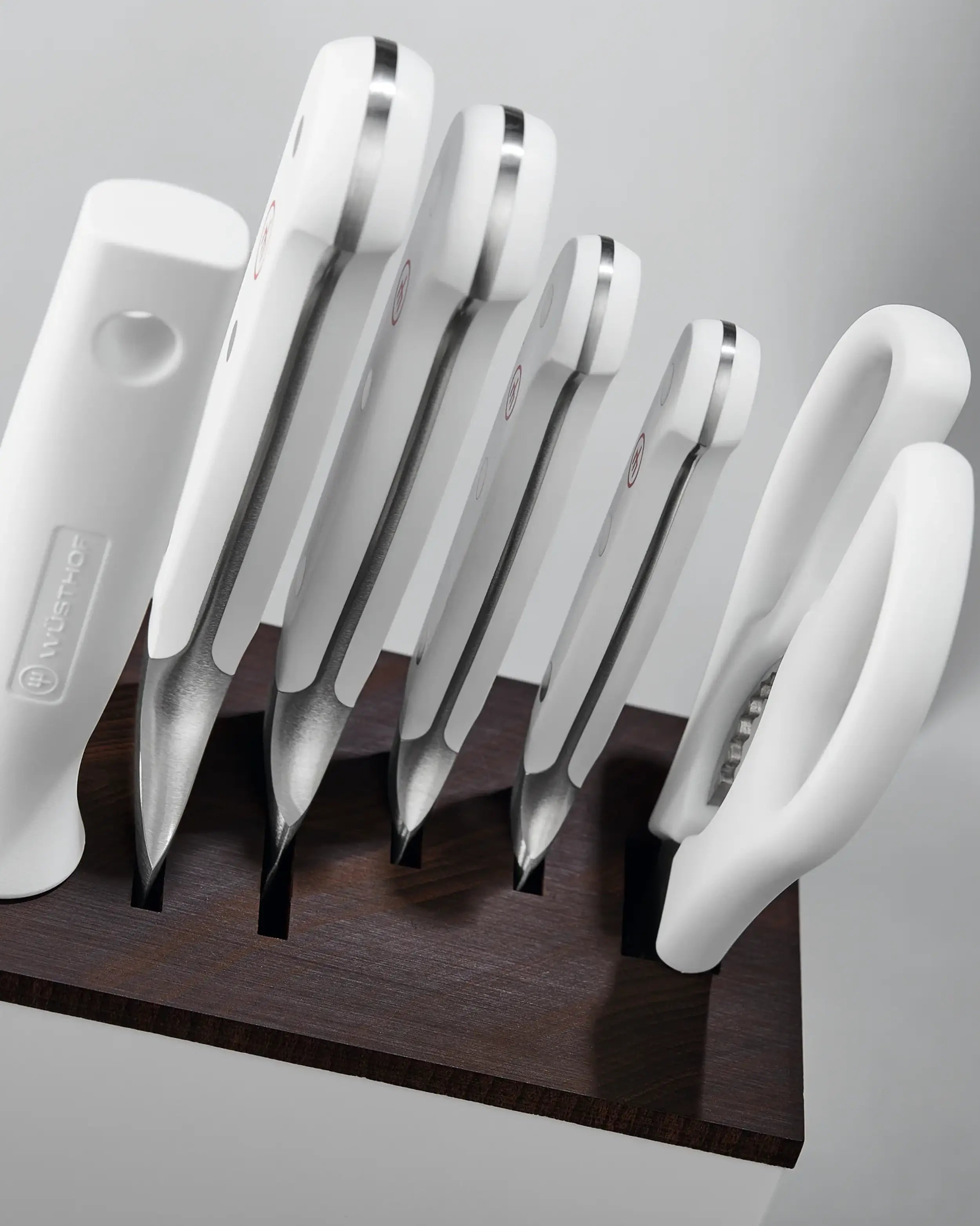 Perfeito para espaços pequenos ou configurações simplificadas, este wusthof classic white 6 items knife block acomoda 5 facas e 2 acessórios essenciais, como afiador de facas ou tesouras de cozinha. Quer esteja a iniciar um Wüsthof set ou a completar o seu wusthof knife block set, este modelo oferece organização precisa sem sobrecarregar o seu balcão.