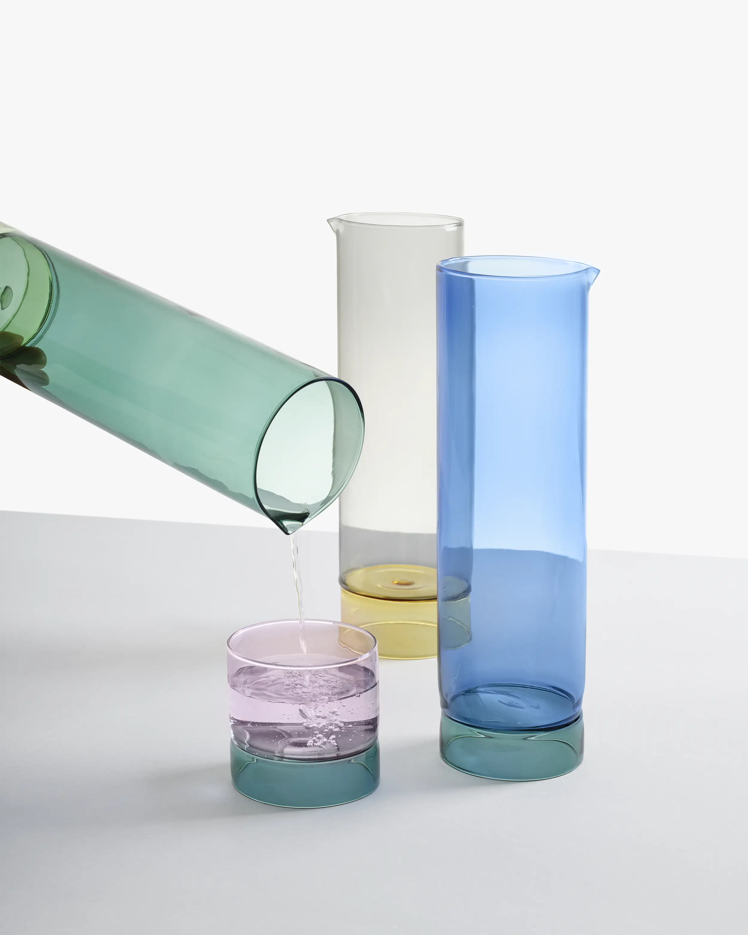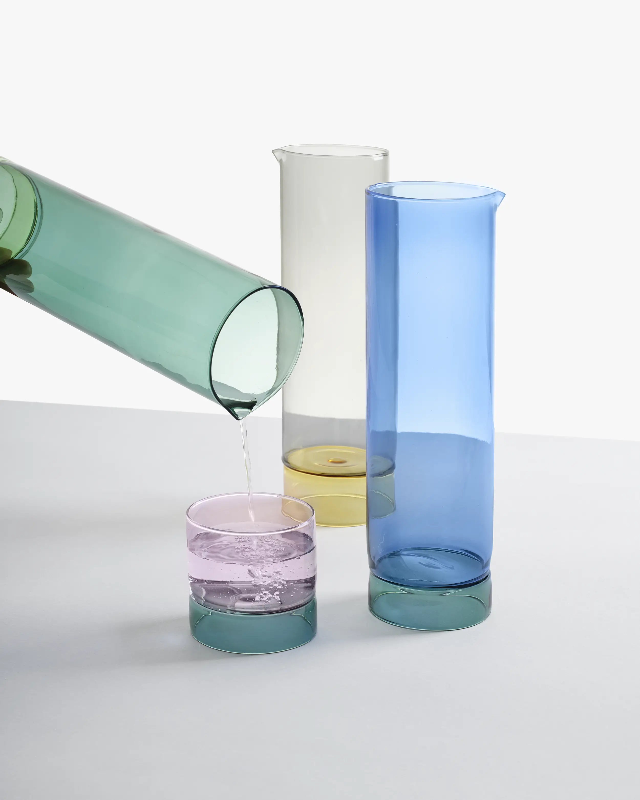 Available in elegant tones of light blue, green and smoke, the jug adds a chromatic accent to everyday rituals. Each combination, whether petrol and mint or yellow and smoke, introduces a refined balance of contrast and depth. It pairs gracefully with Ichendorf stemmed glasses, iconic tumblers and glasses, and the Botanica collection, creating a dialogue between nature-inspired shapes and minimalist modern glassware.