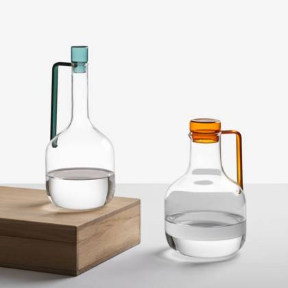 Each Liberta carafe is handcrafted and lamp-worked from borosilicate glass, a material chosen for its strength, clarity, and delicacy. This process ensures that every jug is unique, with subtle variations that testify to its artisanal origin. Lightweight yet resistant, it is suitable for alimentary use and dishwasher safe at low temperatures (40 °C / 104 °F recommended). The lid, besides protecting the contents, also becomes a decorative feature; a chromatic accent that enriches the object even when displayed empty, turning a simple jug into an elegant centrepiece.