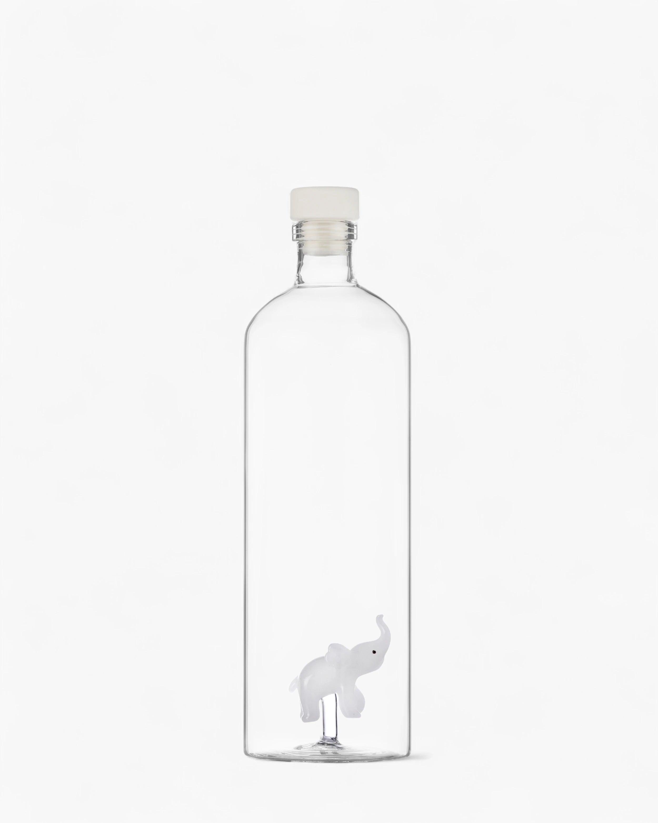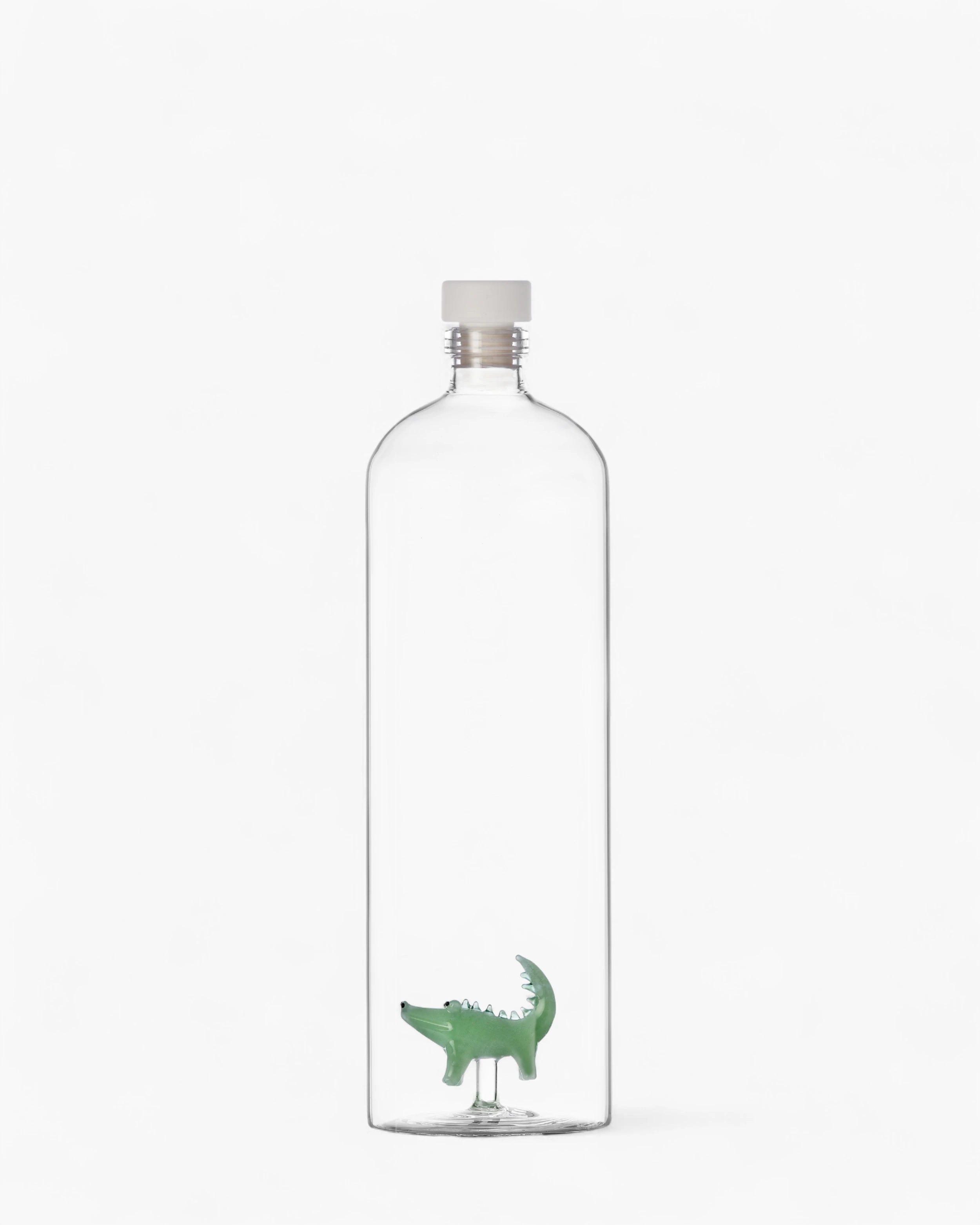 Используемая для подачи воды, соков или вина, эта бутылка делает больше, чем просто хранит жидкости: она становится центром внимания и разговоров. Фигурка крокодила или слона игриво появляется внутри прозрачной структуры, вызывая любопытство и восхищение. Это объект, который объединяет практическое использование с скульптурным присутствием, редкое сочетание повседневной функции и коллекционного дизайна.