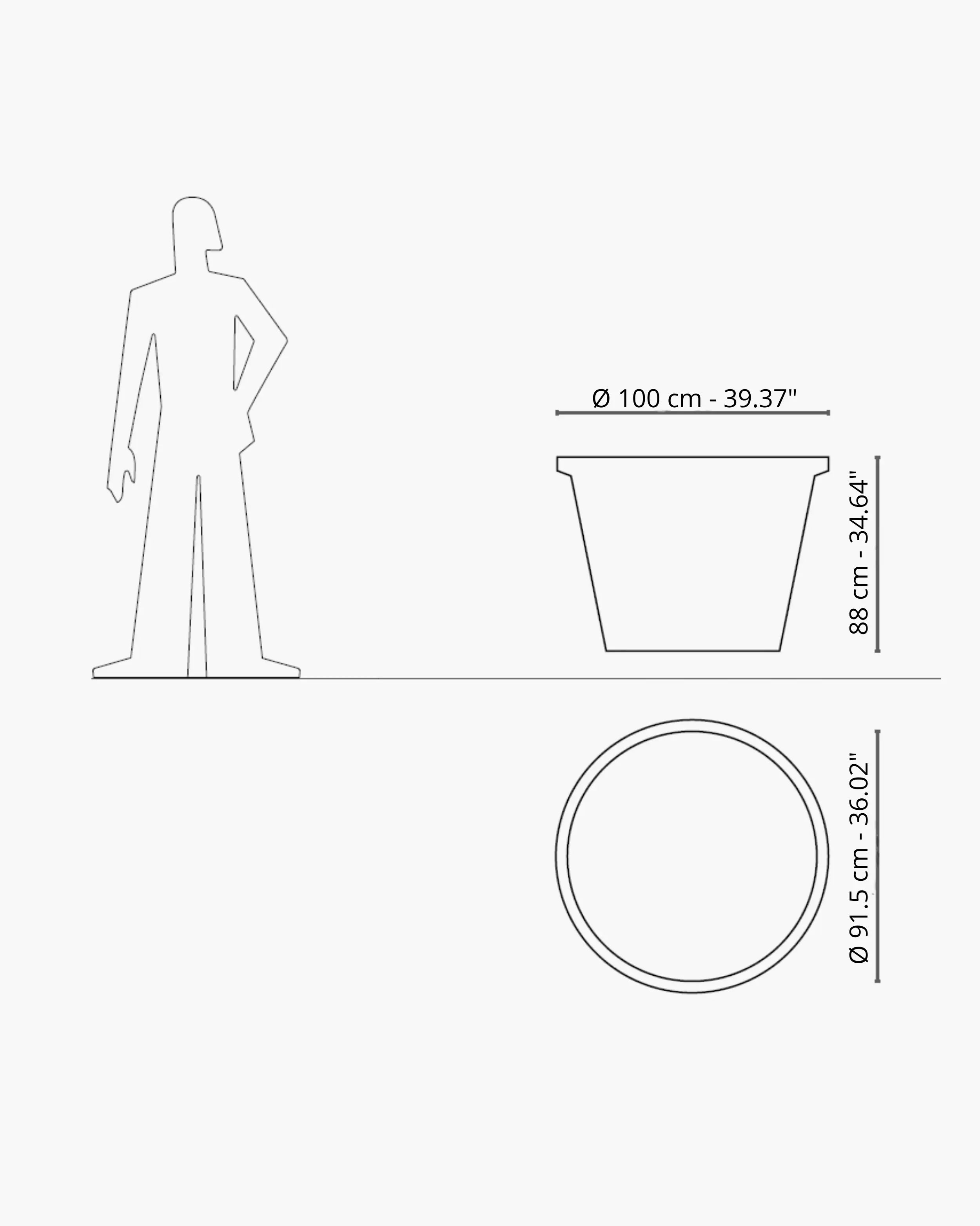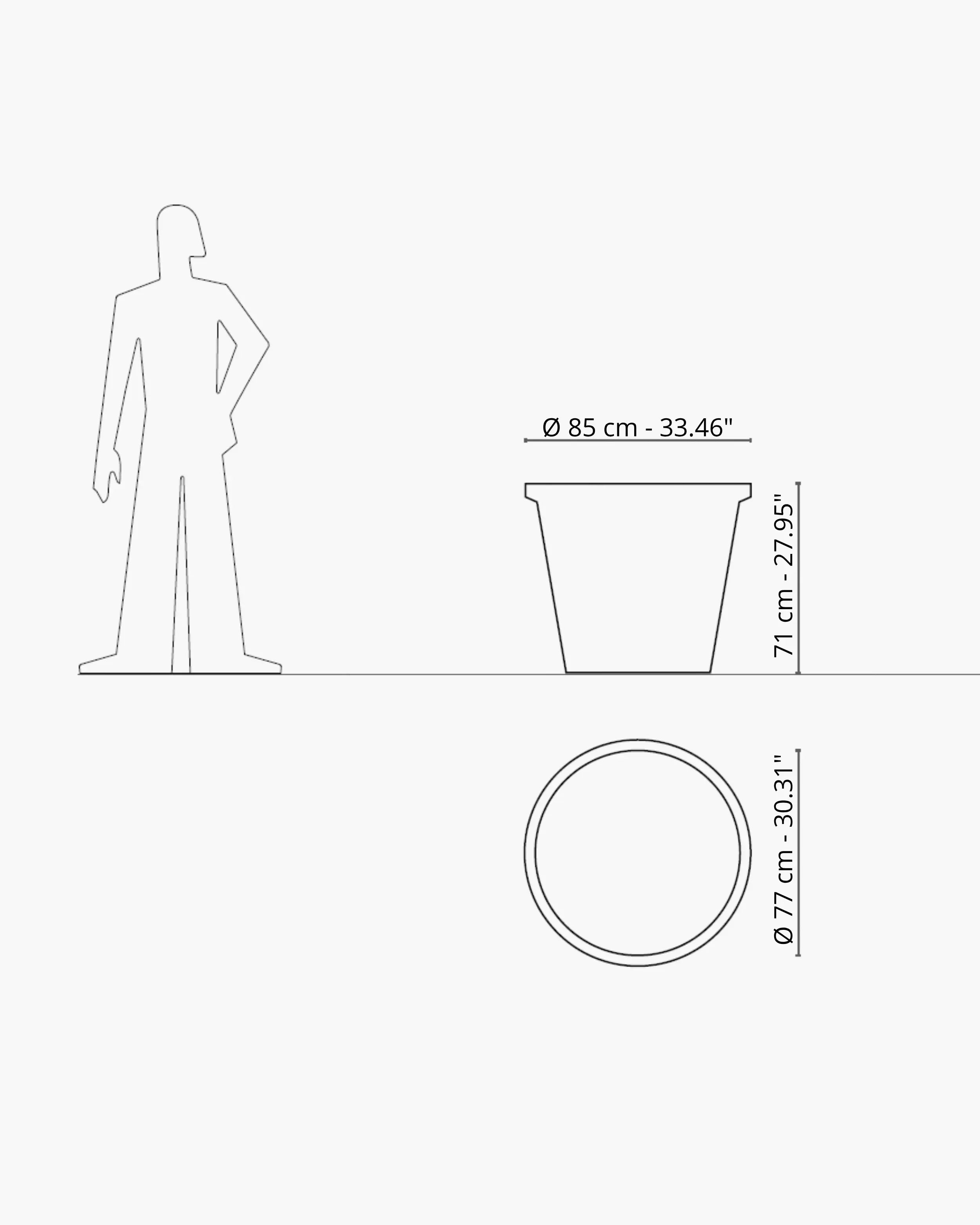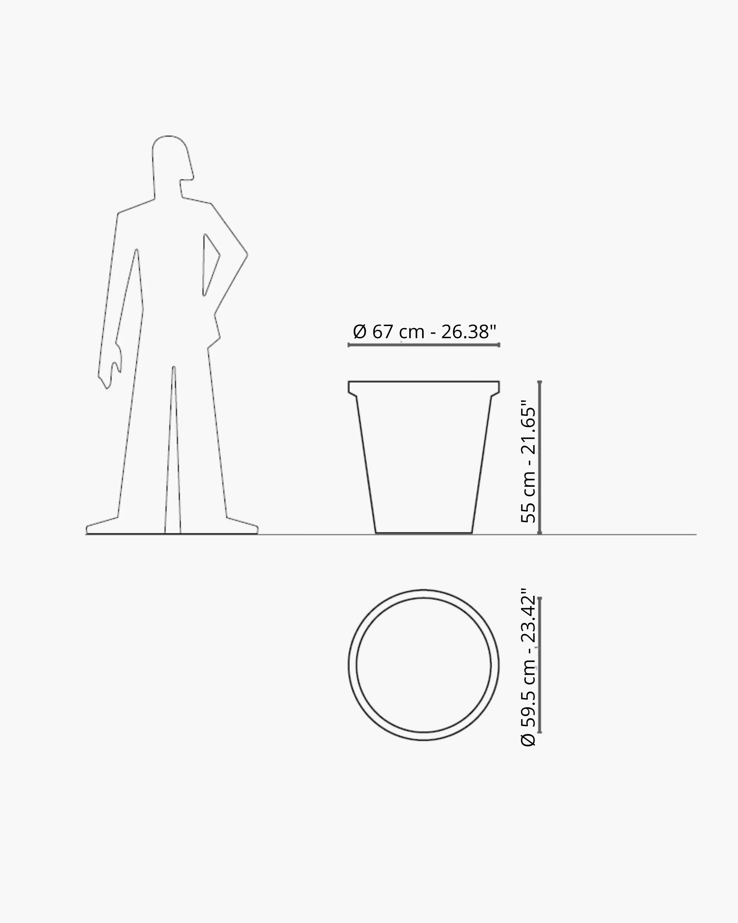 Предлагается в высотах 55, 71 и 88 см, этот архитектурный вазон изящно адаптируется к разным средам: от уютных террас до просторных гостиничных дворов. Его цветовая гамма охватывает нежные нейтральные оттенки, такие как голубиный и меловой, насыщенные земляные тона, такие как терракота и помпейский красный, а также яркие акценты, такие как желтый и британский зеленый. Эти варианты позволяют дизайнерам адаптировать композиции под свое видение.