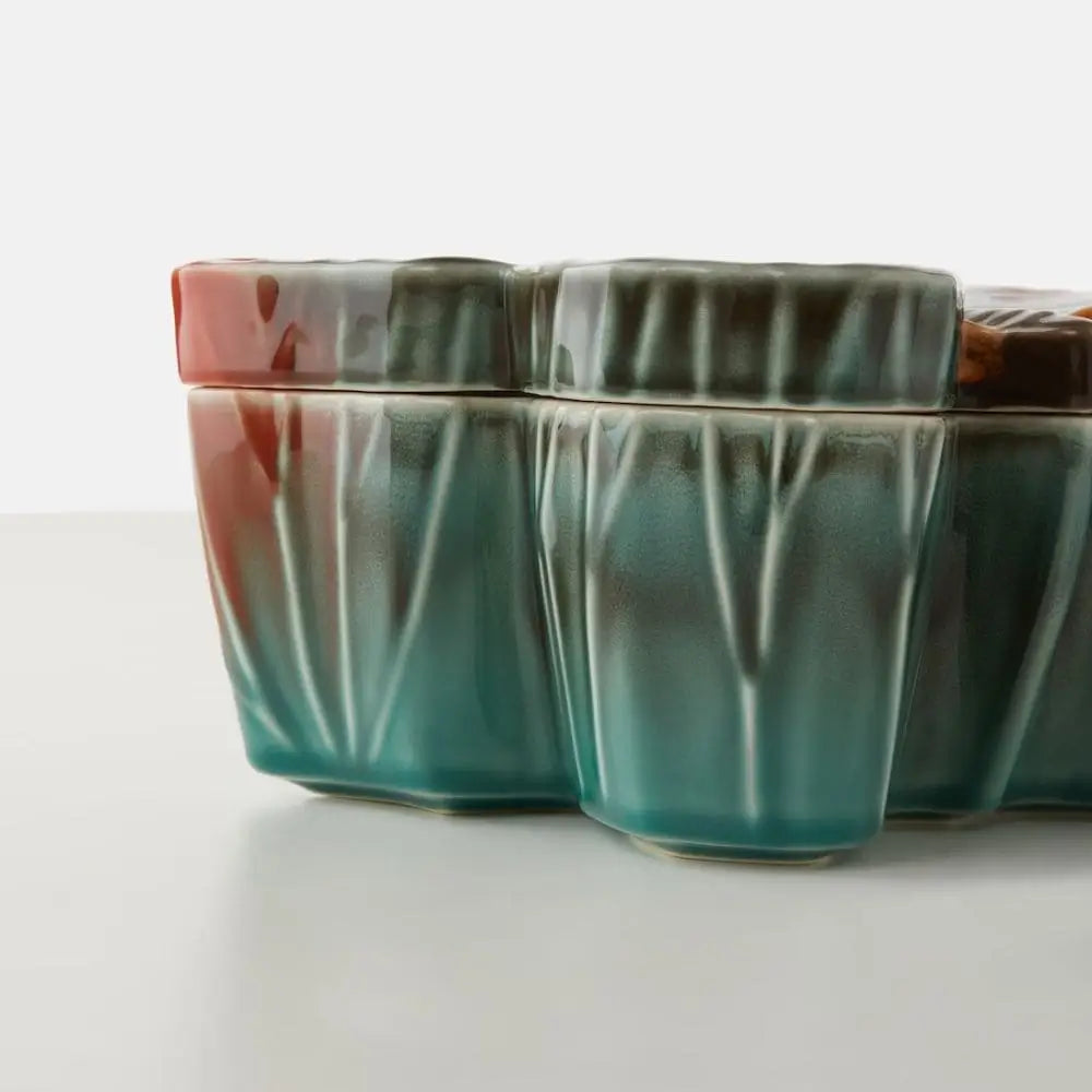 Каждый элемент этого расписного вручную изделия раскрывает мастерство ремесленников Bordallo Pinheiro. Тонкая глазурь и нюансированная текстура отражают столетнюю традицию керамического совершенства бренда. Изготовленный из терракоты, он воспевает аутентичность материала и тактильное тепло. Поверхность игриво ловит свет, словно солнечные лучи на крыльях бабочек, тонкий намёк на увлечение дизайнера органическими узорами и гармонией. Каждая коробка формуется и раскрашивается вручную, что гарантирует уникальность каждой детали.