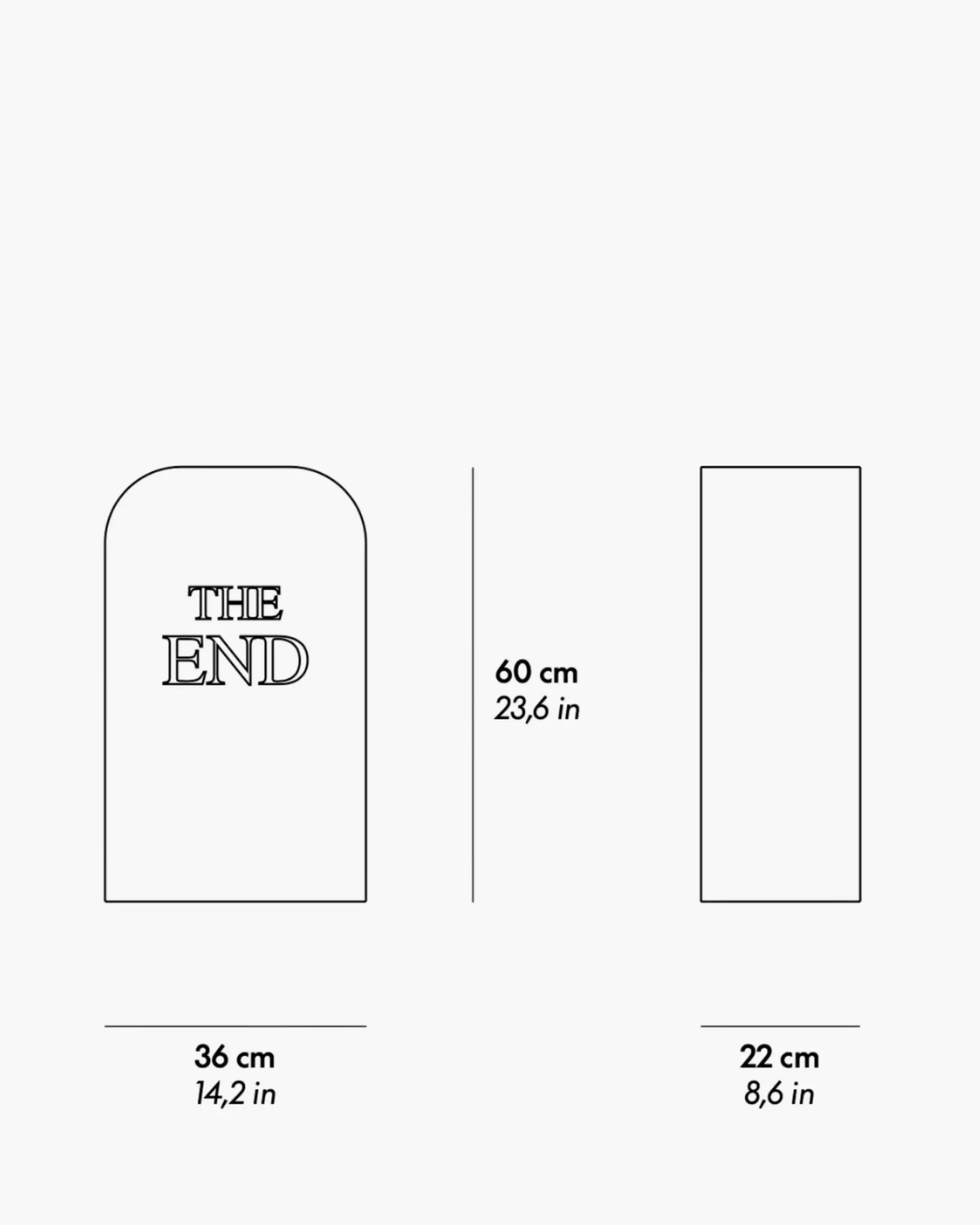 Часть сотрудничества между Gufram и Toiletpaper, The End резонирует с другими радикальными творениями, такими как Sassi от Piero Gilardi x Gufram или провокациями Ceretti/Derossi/Rosso. Оно также органично вписывается в эклектичные интерьеры вместе с другими предметами из коллекции Cattelan & Ferrari x Gufram или другими продуктами Toiletpaper, подчеркивая свою природу концептуального дизайнерского объекта, сочетающего искусство и сатиру. Где бы оно ни стояло — в гостиной, галерее или проекте гостеприимства — оно мгновенно становится смелым поводом для разговора.