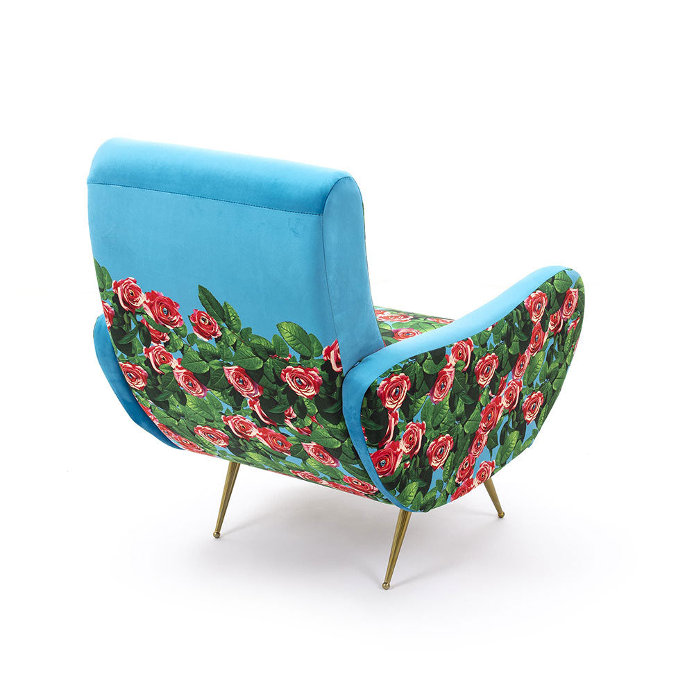 Built with a robust wooden frame, covered with high-density polyurethane padding and a premium textile upholstery, this polyurethane padded armchair ensures superior comfort and resilience. Its non-removable fabric cover preserves the precision of its volumes, while the brassed metal legs armchair add a golden glow that balances its eccentric pattern with elegance. Every line, seam, and curve reflects the same meticulous craftsmanship found across the Toiletpaper Home Furniture collection. The quality of the fabric armchair and its sophisticated materials make it suitable for both private residences and exclusive hospitality spaces, offering a tactile and visual pleasure that only Italian design can deliver.