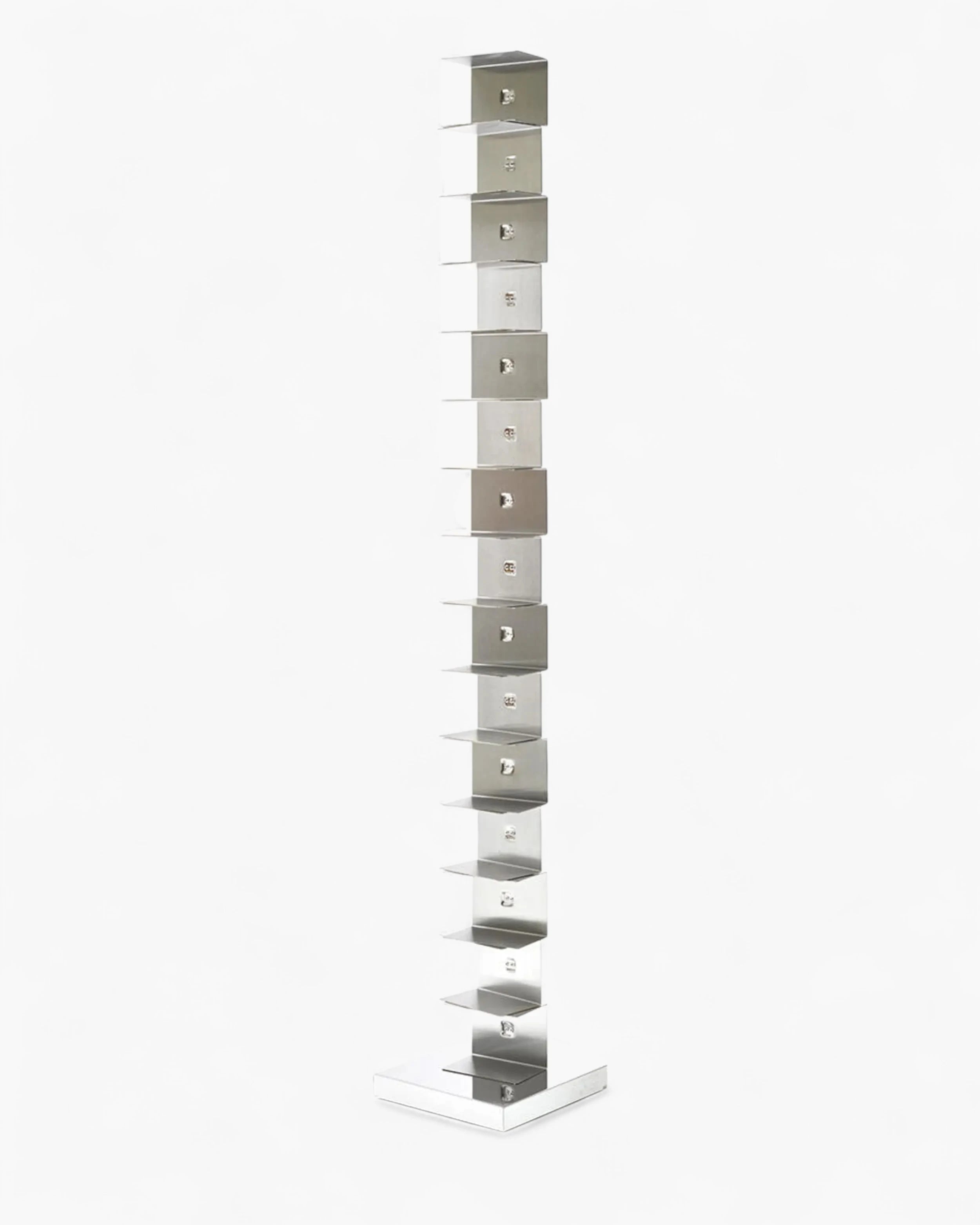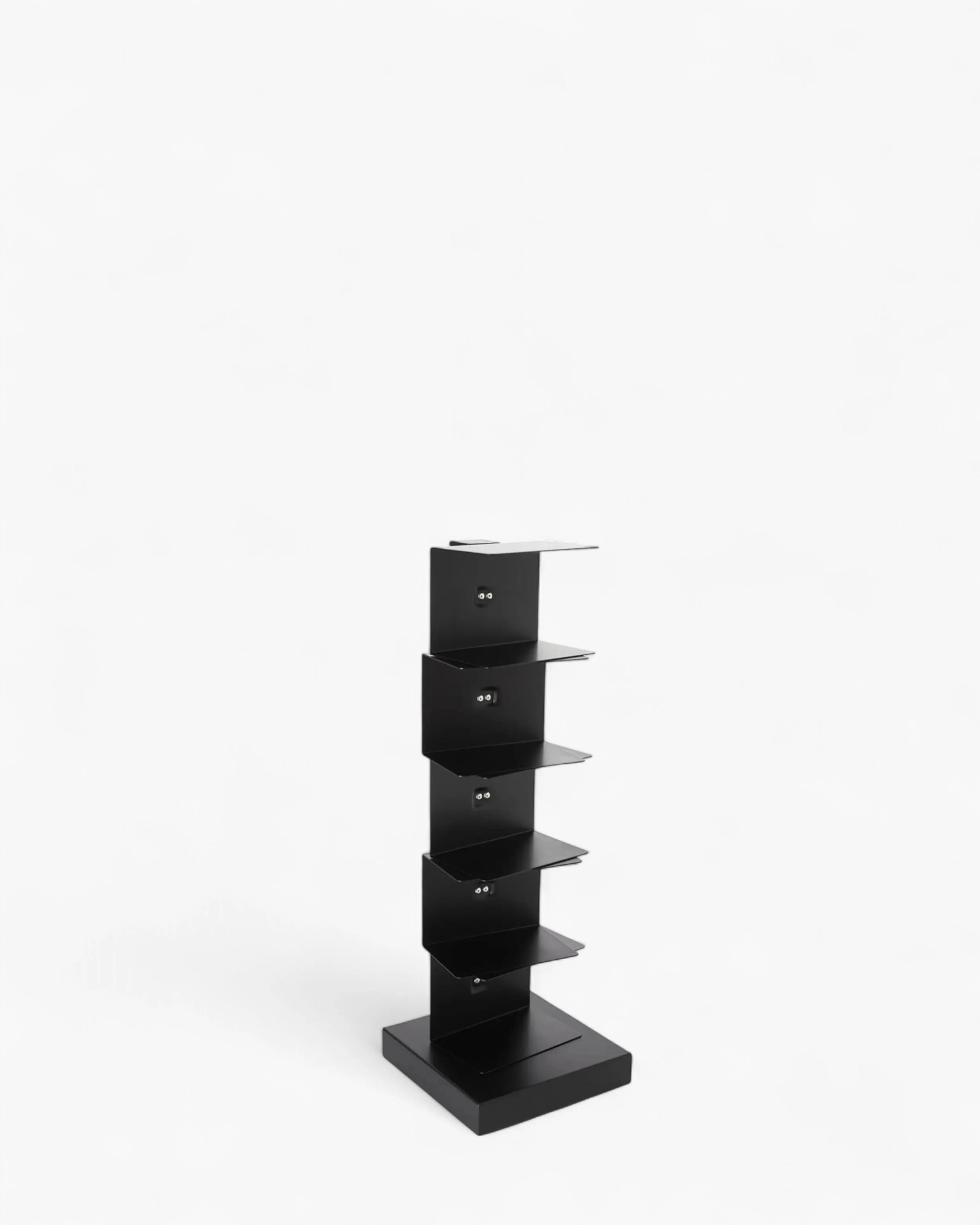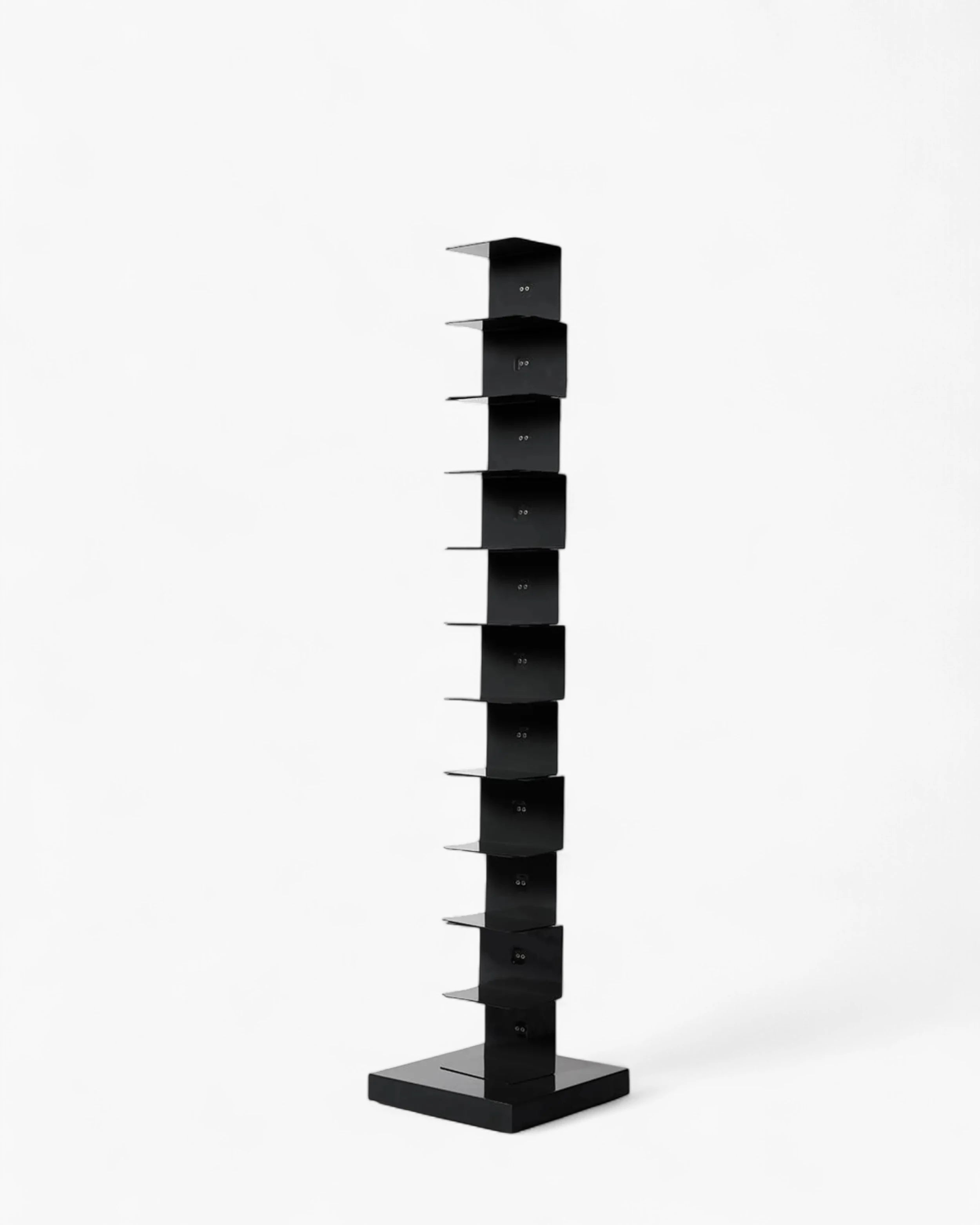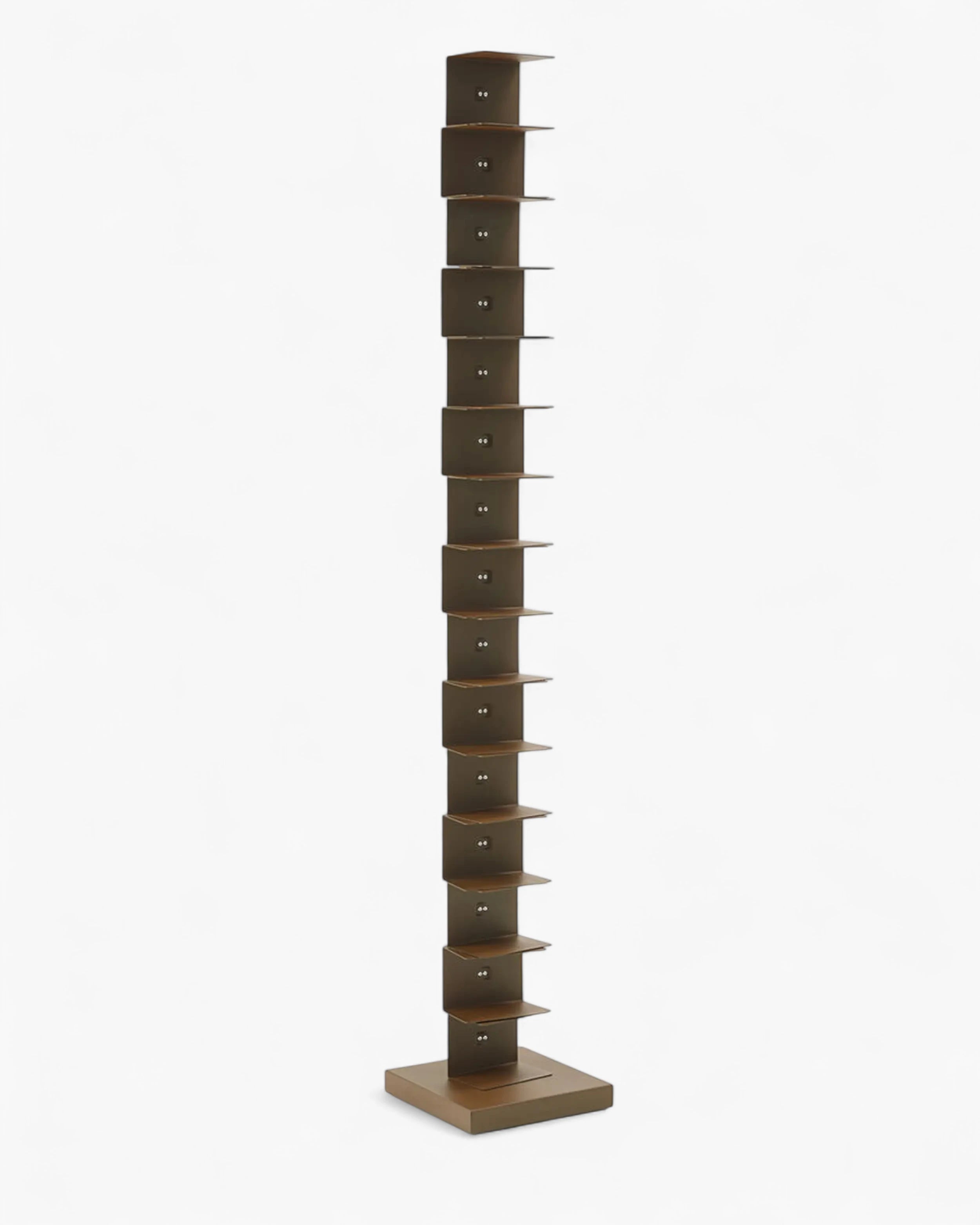 獨立書櫃,鋼柱隱藏了一系列薄層架,既能承載書堆又保持輪廓纖細。產品為組裝式,配有可調腳以適應不平整地面,並設計用於室內。儘管外觀輕盈,容量卻相當慷慨:約可容納 35 本書,每層最大承重 2 公斤,讓書堆長時間保持整齊安全。