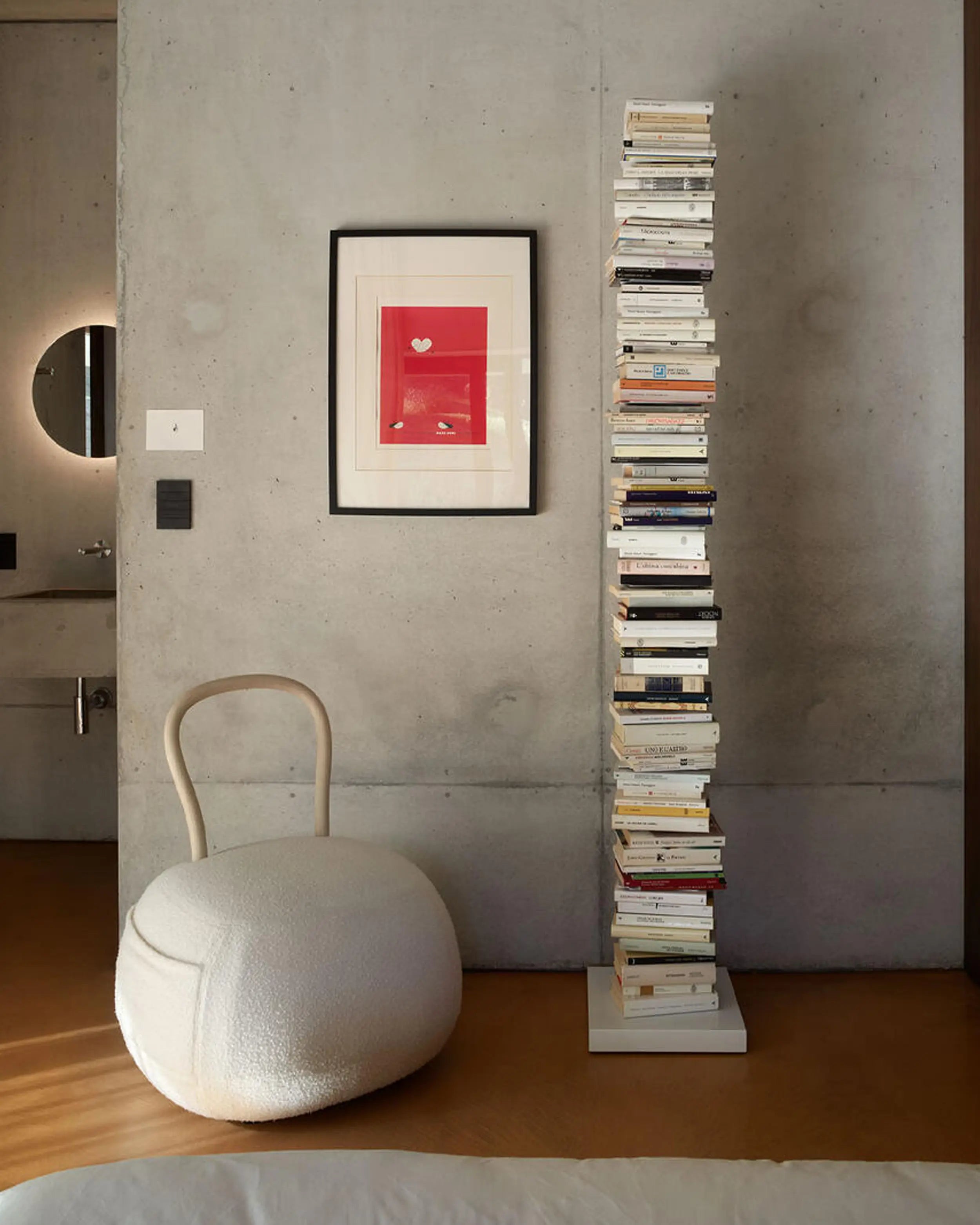 柱狀書櫃,在不增加視覺負擔的情況下穩固場景。